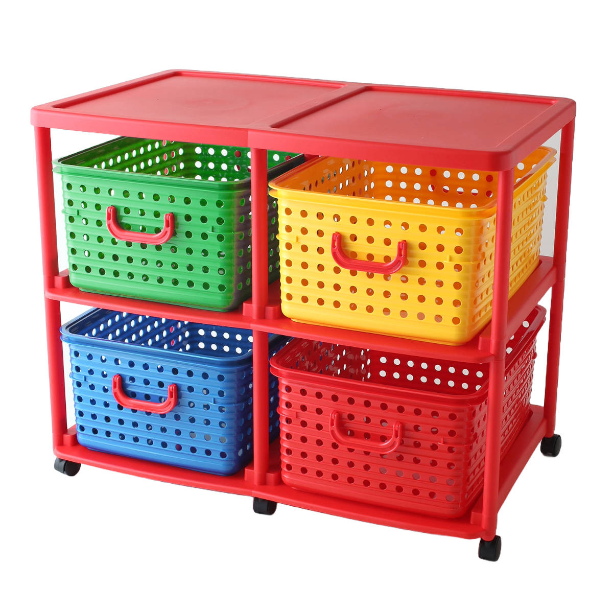 おもちゃ箱 幅87cm バスケットラック 2段 キャスター付き バスケット 4個付き ( かご カゴ オモチャ入れ 収納ボックス 簡単組立 ラック 衣類 収納 大容量 プラスチック製 子供 子ども 引き出し ランドセルラック ) 【カラフル】