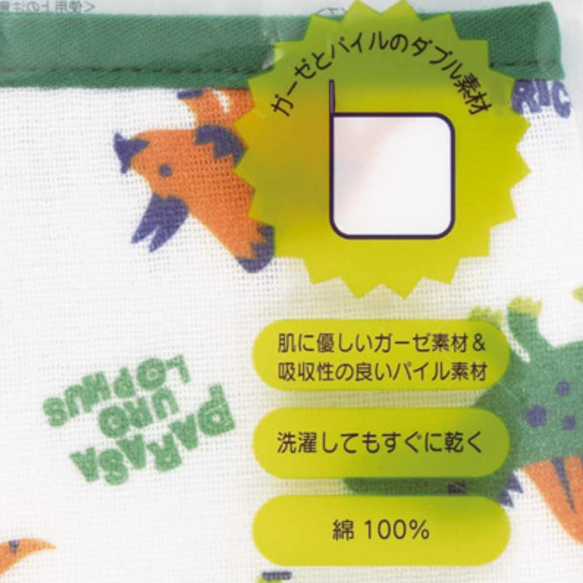 ●綿100%のガーゼとパイルのダブル素材で、優しい肌触りです。