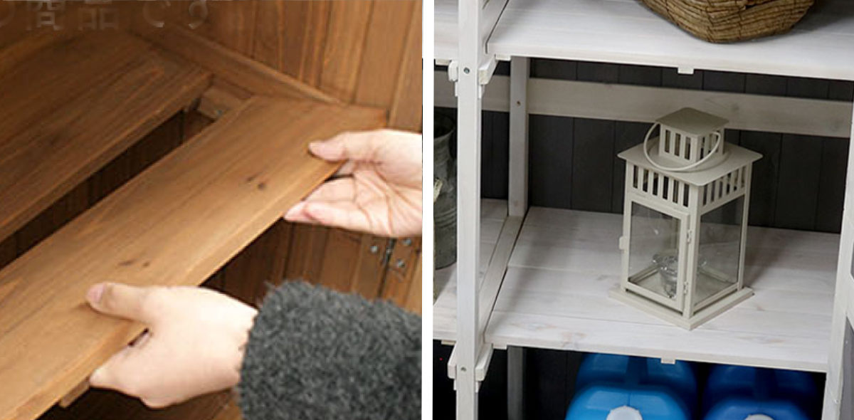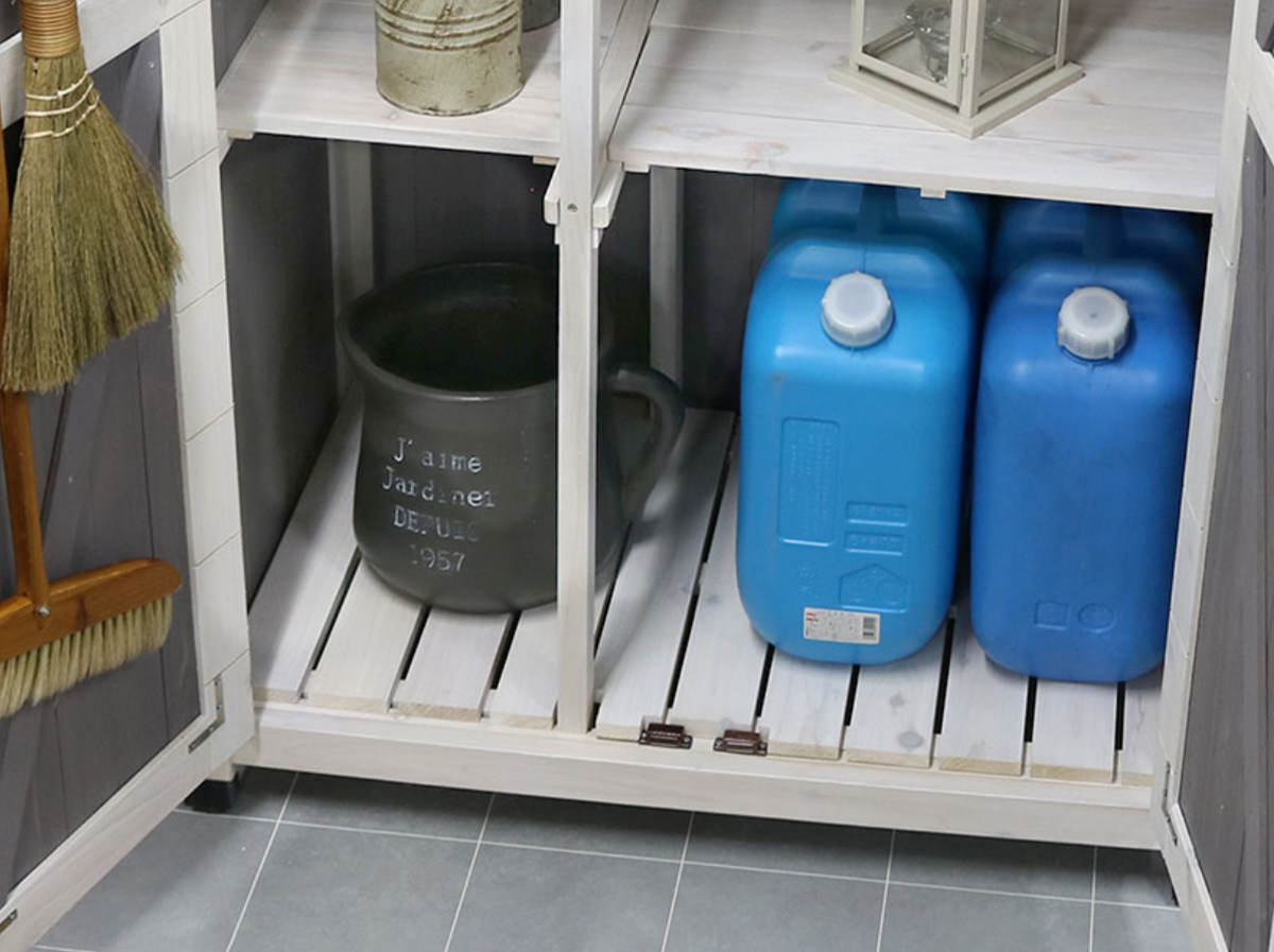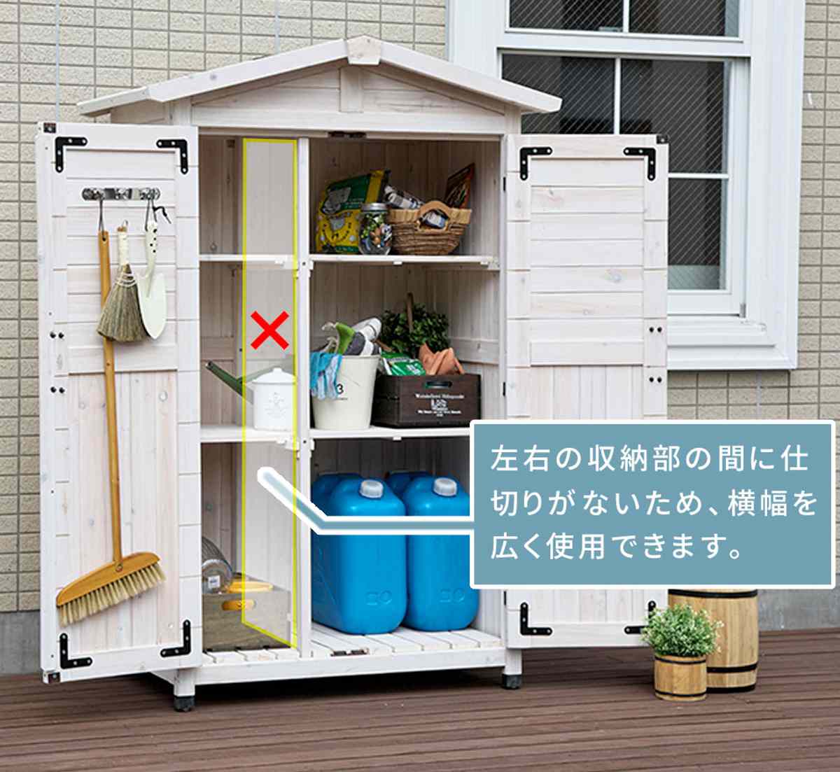 灯油タンクもすっきり収まる、下部奥行55cmのスリム設計。ポリタンクが縦に入れられます。棚板を外せばホウキやデッキブラシ、園芸用支柱、パラソルなど背の高い道具もまとめて収納できます。真ん中の仕切りがないので、横幅を広く使用できます。