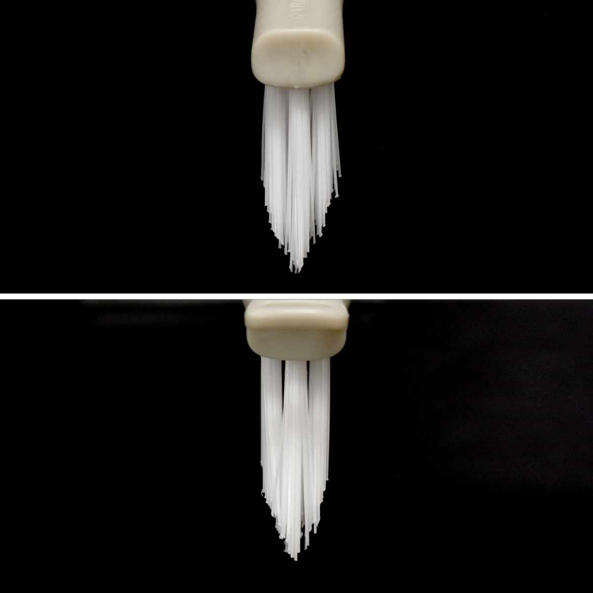 2本のブラシで蛇口まわりの細かい汚れを隅々まで掃除できます。V字カットされた先端が、手の届きにくい隙間や複雑な形状の奥までしっかり届きます。