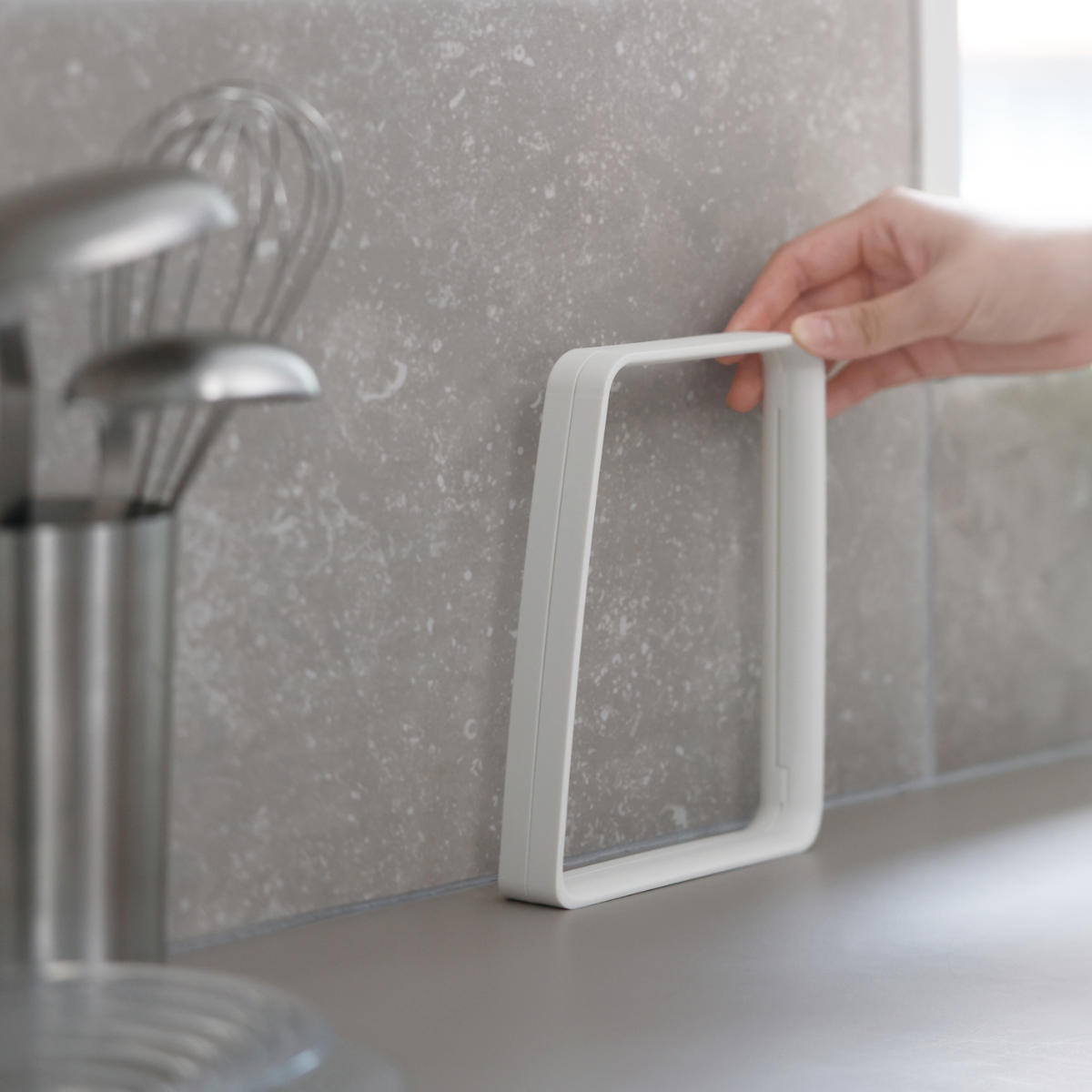 開いたフレームの間にポリ袋を入れて、奥から手前の順にかけるだけ。使い終わった後の取り外しもスムーズです。