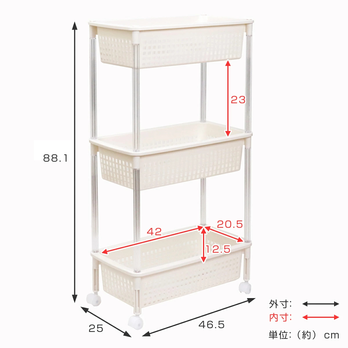 ランドリーバスケット バスケットワゴンスリム 3段 キャスター付 ( ランドリーワゴン ランドリー バスケット 収納 キャスター付き 日本製 洗濯カゴ 脱衣カゴ ランドリー収納 組立て簡単 キャスター 隙間収納 ホワイト )