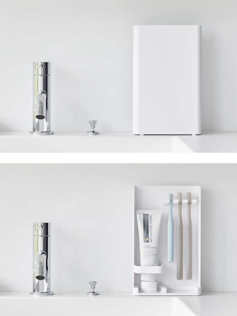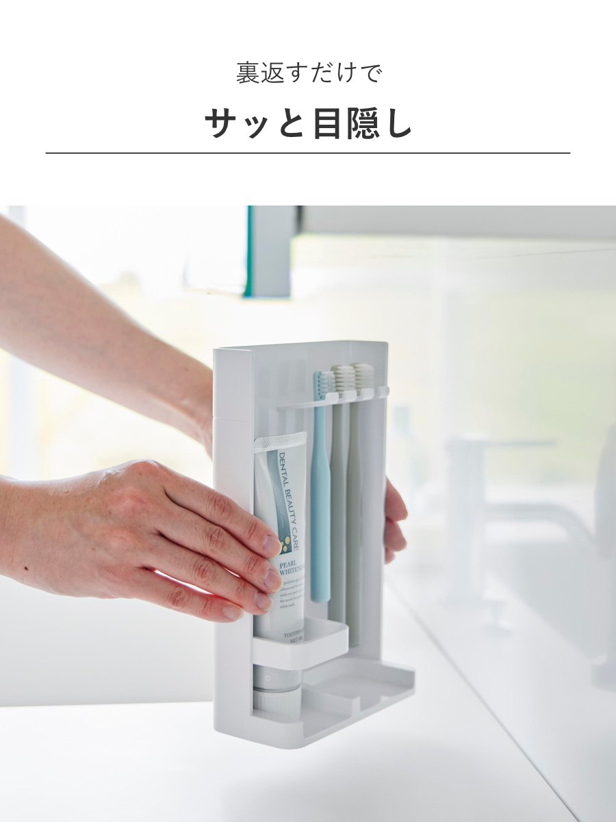 サッと裏返すだけで隠したい時すぐに隠せるスリムな歯ブラシ&チューブスタンドです。生活感がでにくいので洗面台がよりスタイリッシュな印象になります。奥行きは約6cmとスリムで狭い洗面台にも場所をとらずに設置できます。