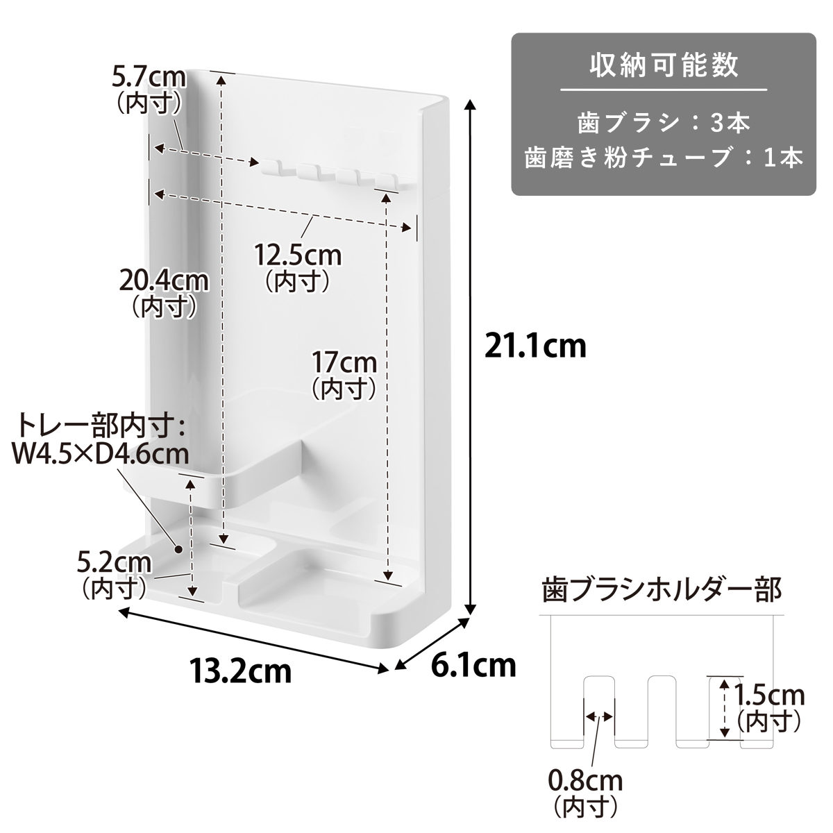| サイズ | 約 幅13.2×奥行6.1×高さ21.1(cm) 歯ブラシホルダー部内寸:約 幅0.8×奥行1.5×高さ17(cm)(1つあたり) チューブホルダー部内寸:約 幅4.5×奥行4.6×高さ5.2(cm) |