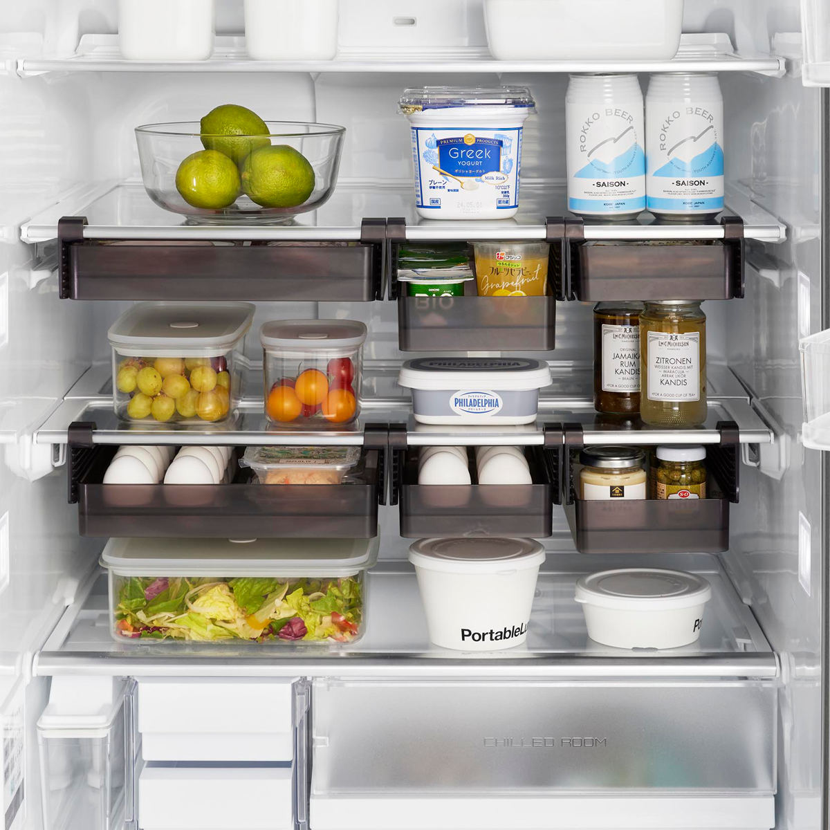 棚下収納ラックシリーズを並べて設置すると無駄な空間がなくなり、冷蔵庫の中の収納力がアップします。収納スペースを細かく分けることで食材の管理もしやすくなります。