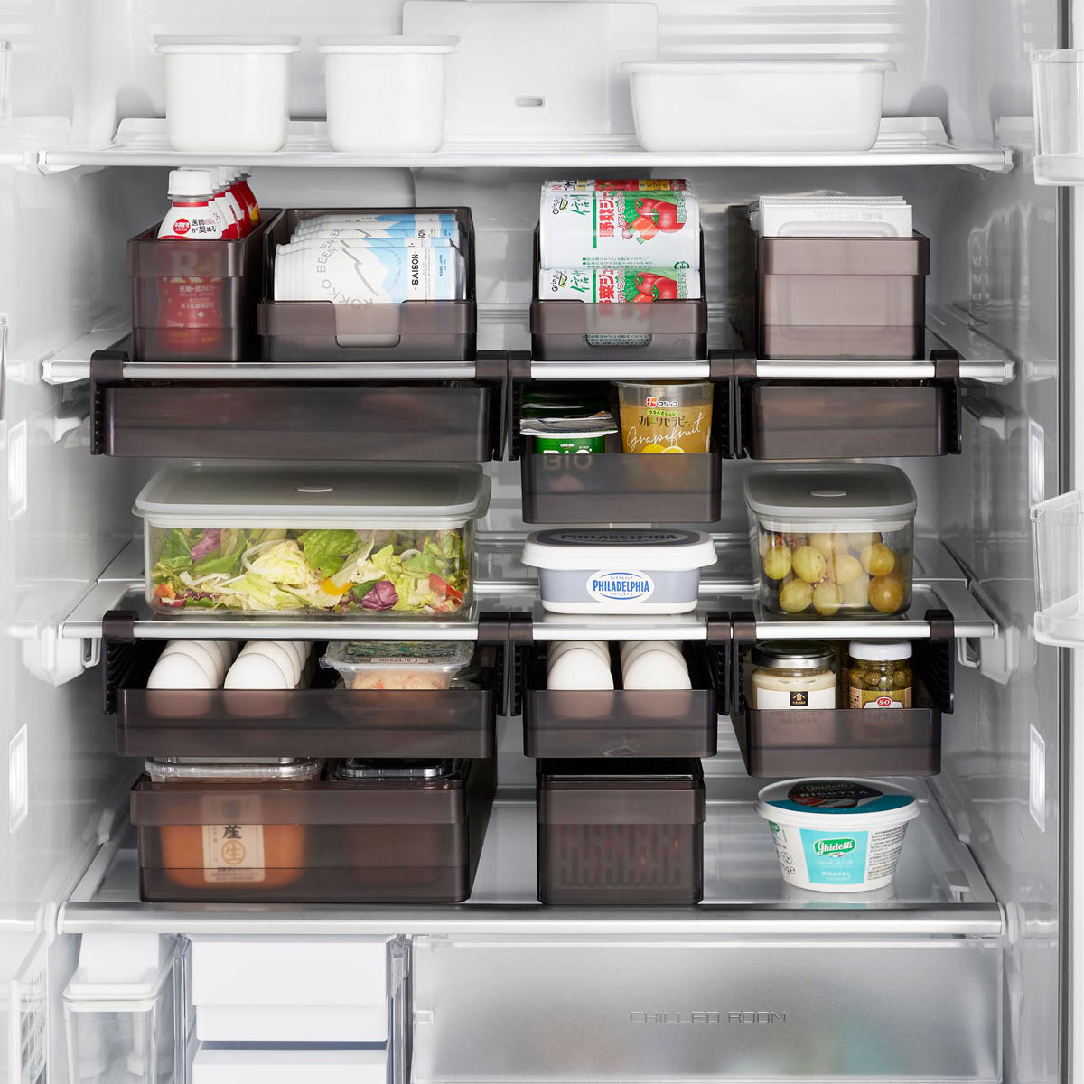 棚下収納ラックシリーズを並べて設置すると無駄な空間がなくなり、冷蔵庫の中の収納力がアップします。収納スペースを細かく分けることで食材の管理もしやすくなります。