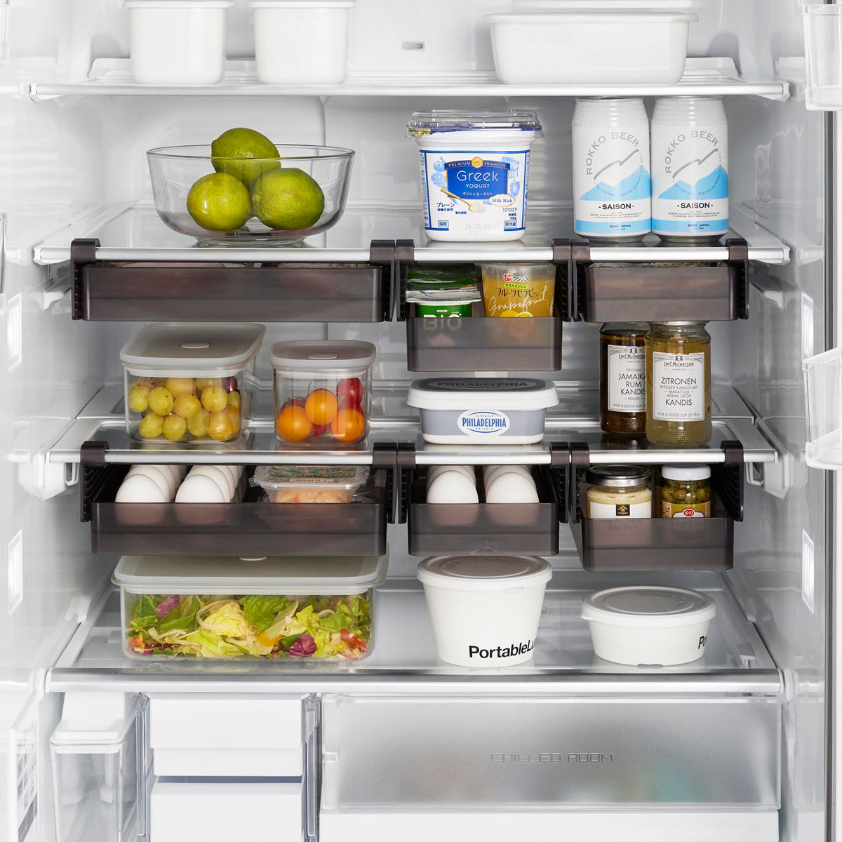 棚下収納ラックシリーズを並べて設置すると無駄な空間がなくなり、冷蔵庫の中の収納力がアップします。収納スペースを細かく分けることで食材の管理もしやすくなります。