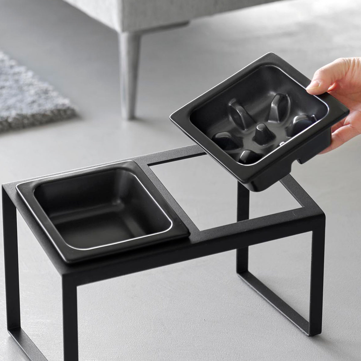 ボウルが2個とスタンドのセットです。フードとお水や2種類のフードなど自由に組み合わせて使えます。