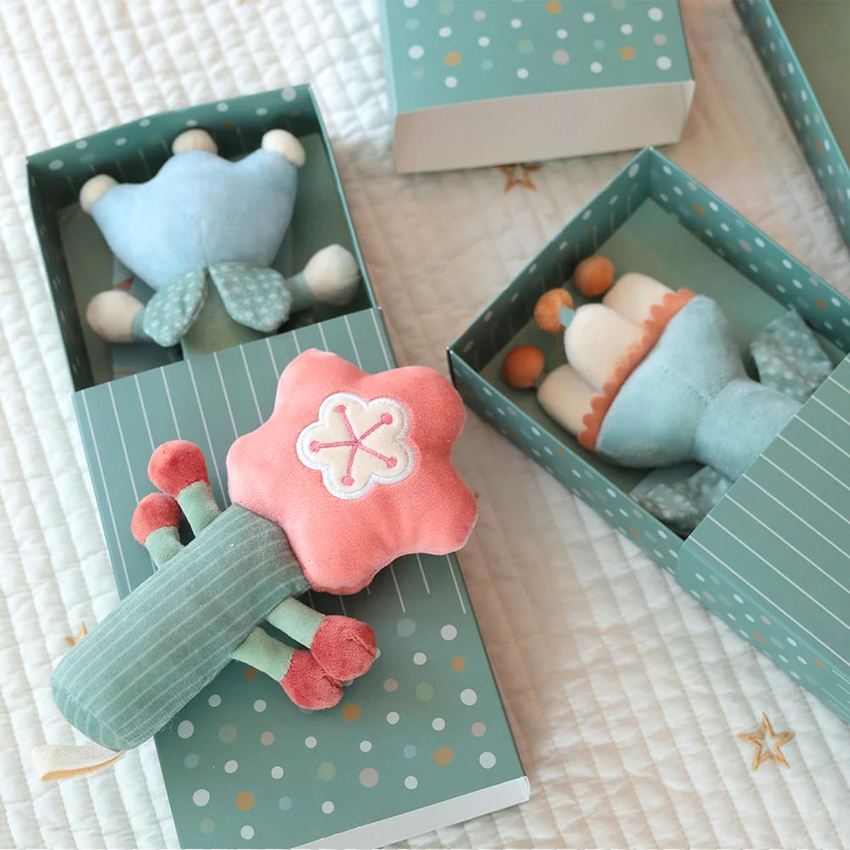 ファーストトイにぴったりなやさしい音とかわいいデザインのベビーラトルです。ふるたびに優しい音が鳴って、赤ちゃんの好奇心をくすぐります。まるで妖精たちがお話ししているようです。