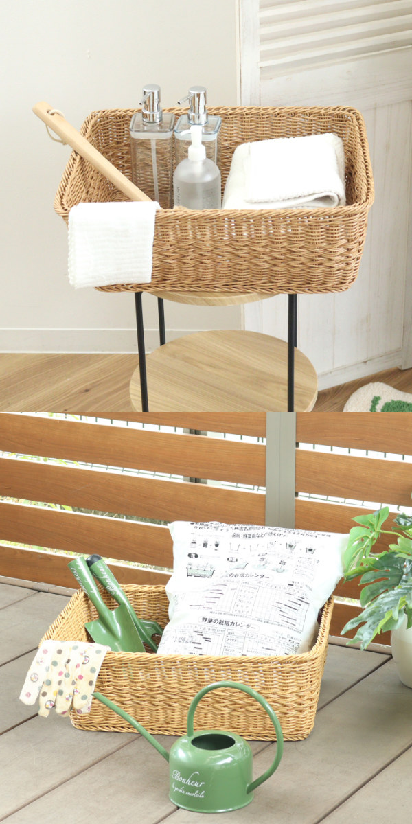 水や湿気に強く多湿な空間でも活躍します。洗濯物やタオルを入れる脱衣かごや、ガーデニング用品の収納、観葉植物カバーにもぴったりです。