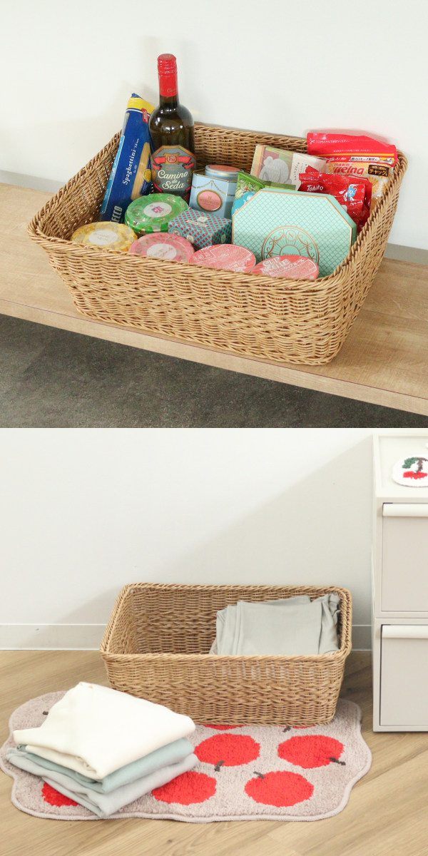 お掃除道具をまとめたり、食品・日用品ストックを入れたりと、さまざまな場所の整理整頓に役立ちます。衣類収納にも適した大きさです。