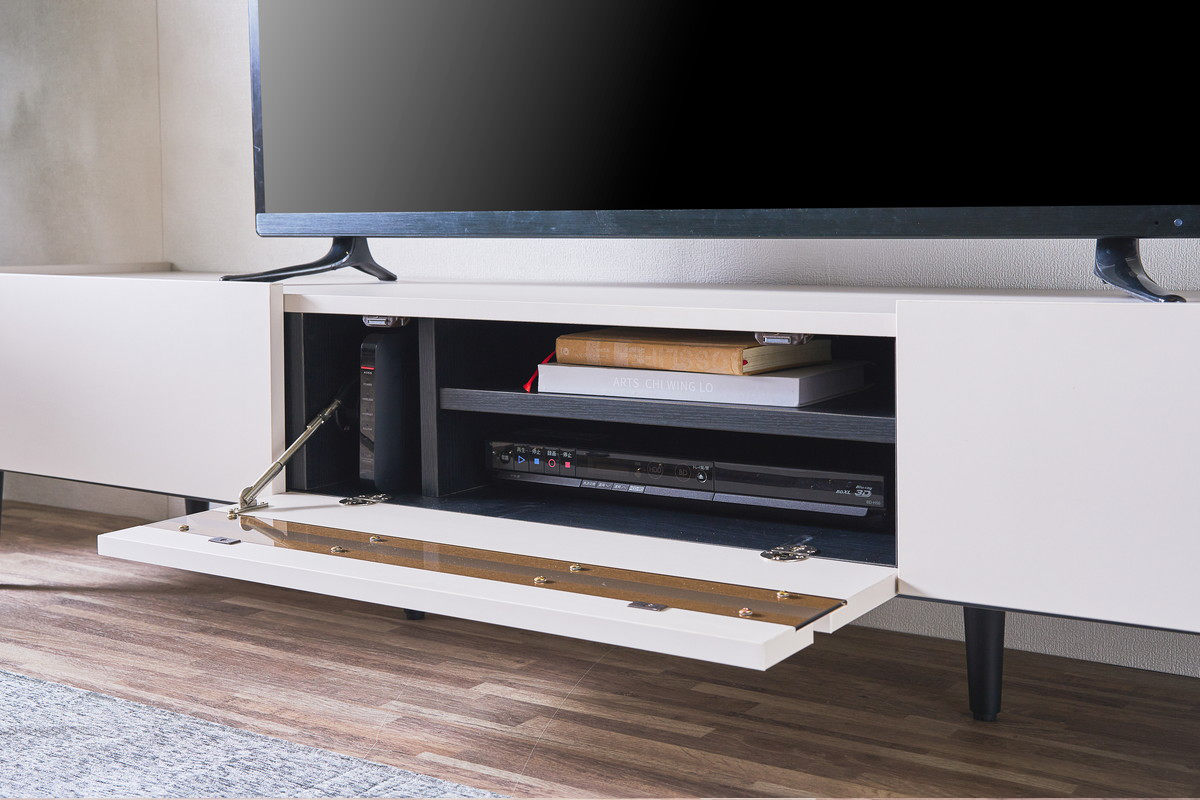 中央のフラップ扉内には横型と縦型の収納スペースがあり、AV機器やルーターなどを収納できます。棚板は取り外しができ、背の高い物も収納可能。前板にはガラスが付いているため、扉を閉めたままでもリモコン操作ができます。