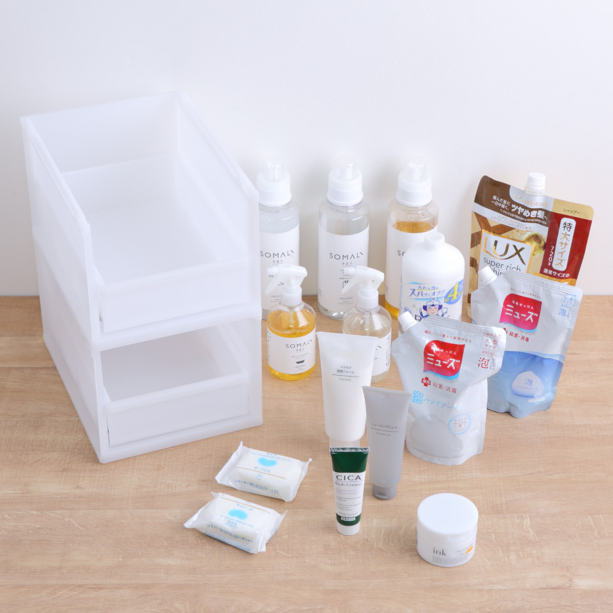 散らかりがちな洗剤や詰め替えボトル、スキンケア用品をすっきり整理できる収納ラックです。高さのあるボトルも収まり、洗面台下のデッドスペースを有効活用できます。半透明の引き出しで中身が見やすく、取り出しやすい設計です。