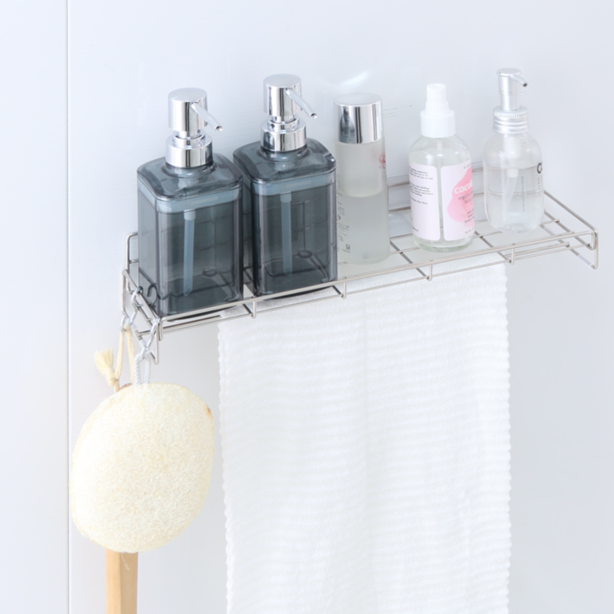 本体にはバーが2本付いているので、ボディタオルを掛けたり、S字フックを使ってバス小物を吊るしたりと、用途に合わせて自由に活用できます。限られた浴室スペースをより快適にお使いいただけます。