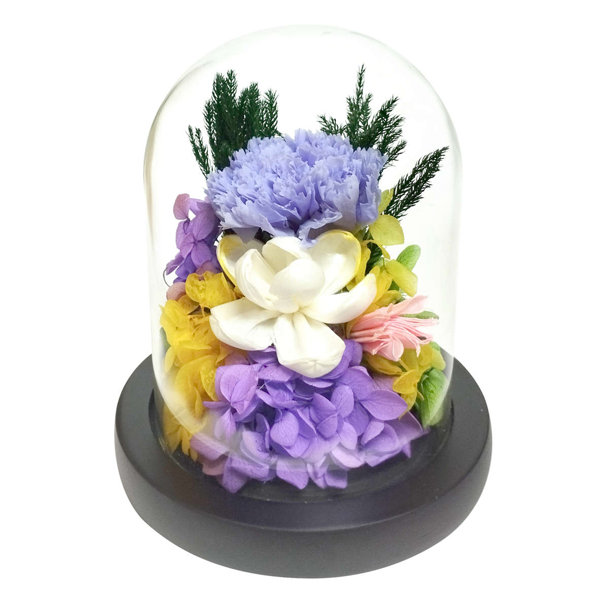 | 材質 | プリザーブドフラワー、アレンジ用スポンジ、ガラス、木製台座 |