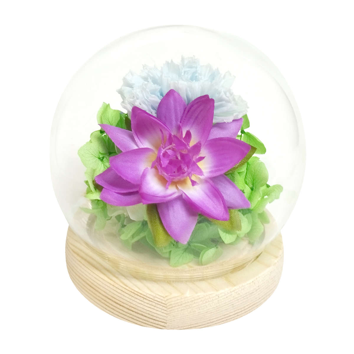 ころんと丸いガラスドームに包まれた、上品なお供え用プリザーブドフラワーアレンジメントです。片手で持てるほどの軽さとサイズ感で、コンパクトなお仏壇におすすめです。