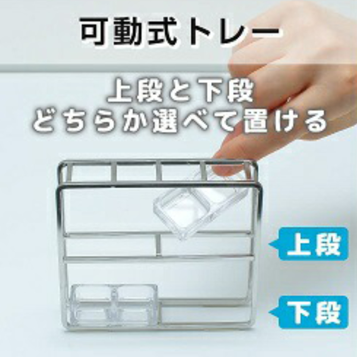 アイテムに合わせてトレーを自由に動かせるので、短い歯間ブラシやフロスもすっきり収納できます。抗菌剤入りで、常に清潔に使えます。