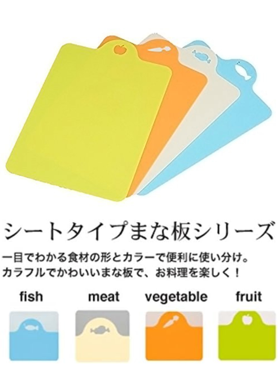 食材カットの使い分けに便利な、色違いのシートタイプまな板4枚セットです。カラーとフック穴の形で見分けられるのでわかりやすく、「魚」「肉」「野菜」「果物」と食材ごとに分けて使える、臭い移り・雑菌移りを気にせず安心してカットできます。