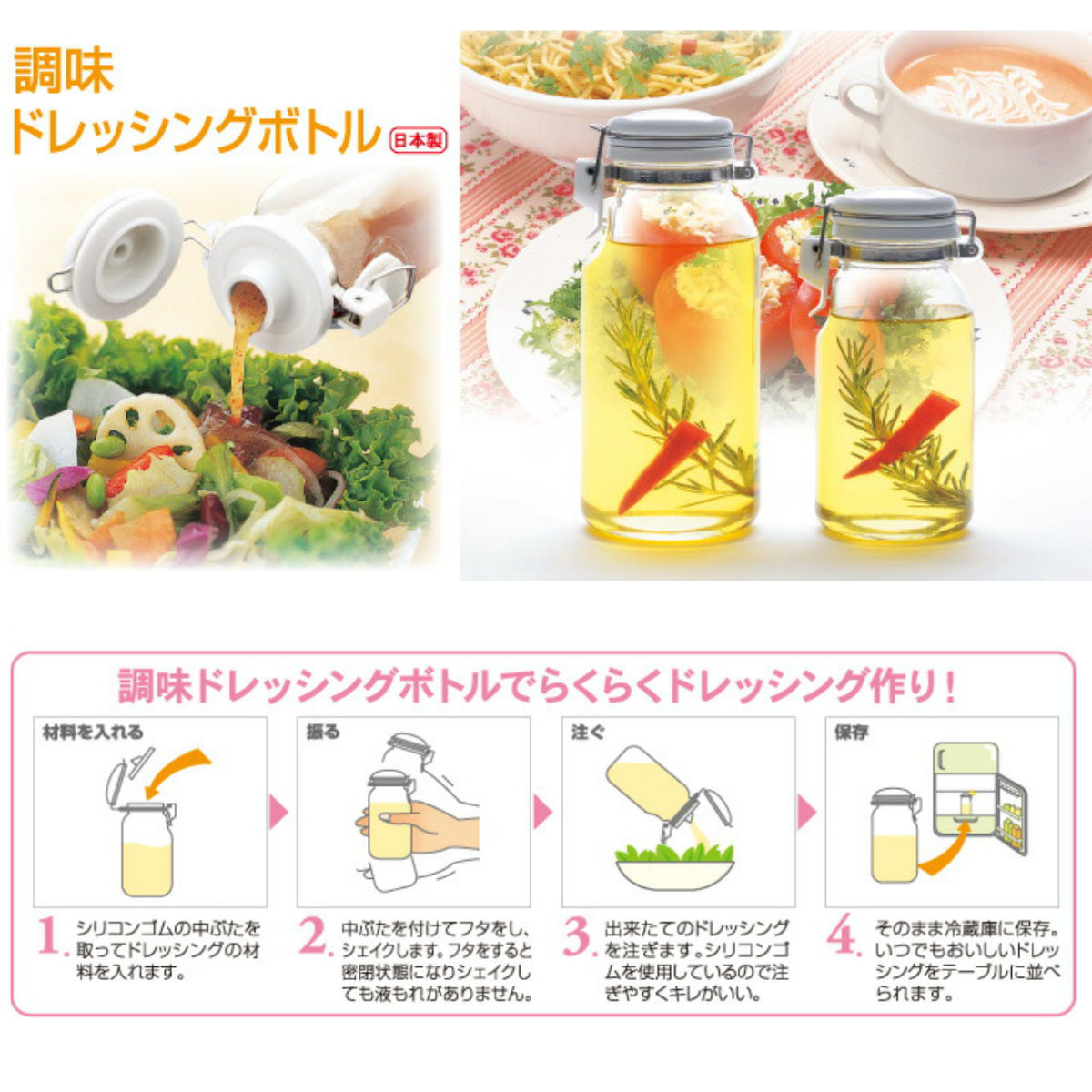 ●ドレッシング作りから、そのまま保存までできる便利なガラスボトルです。