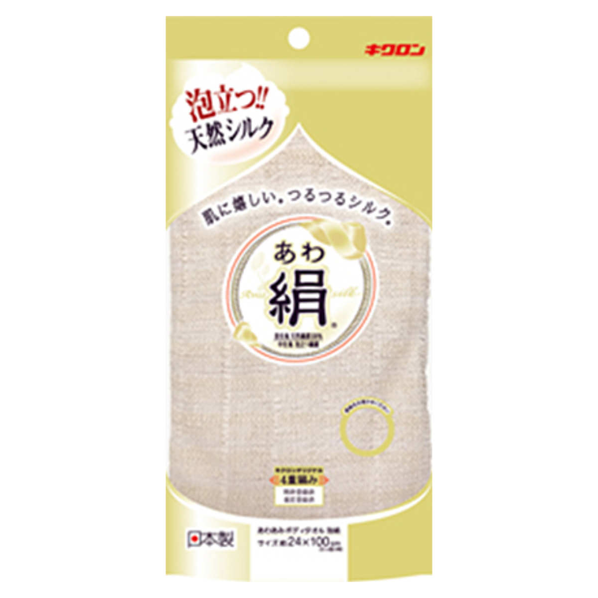 お肌に直接触れる表生地には、やさしい天然絹、綿を使用しています。内側の中生地には泡立ちに優れた特殊繊維を重ねた、キクロンオリジナルの「4重編み構造」を採用しています。空気を含みやすい立体構造が、ボディソープや石けんの泡をしっかりキャッチし、たっぷりの泡をつくり出します。