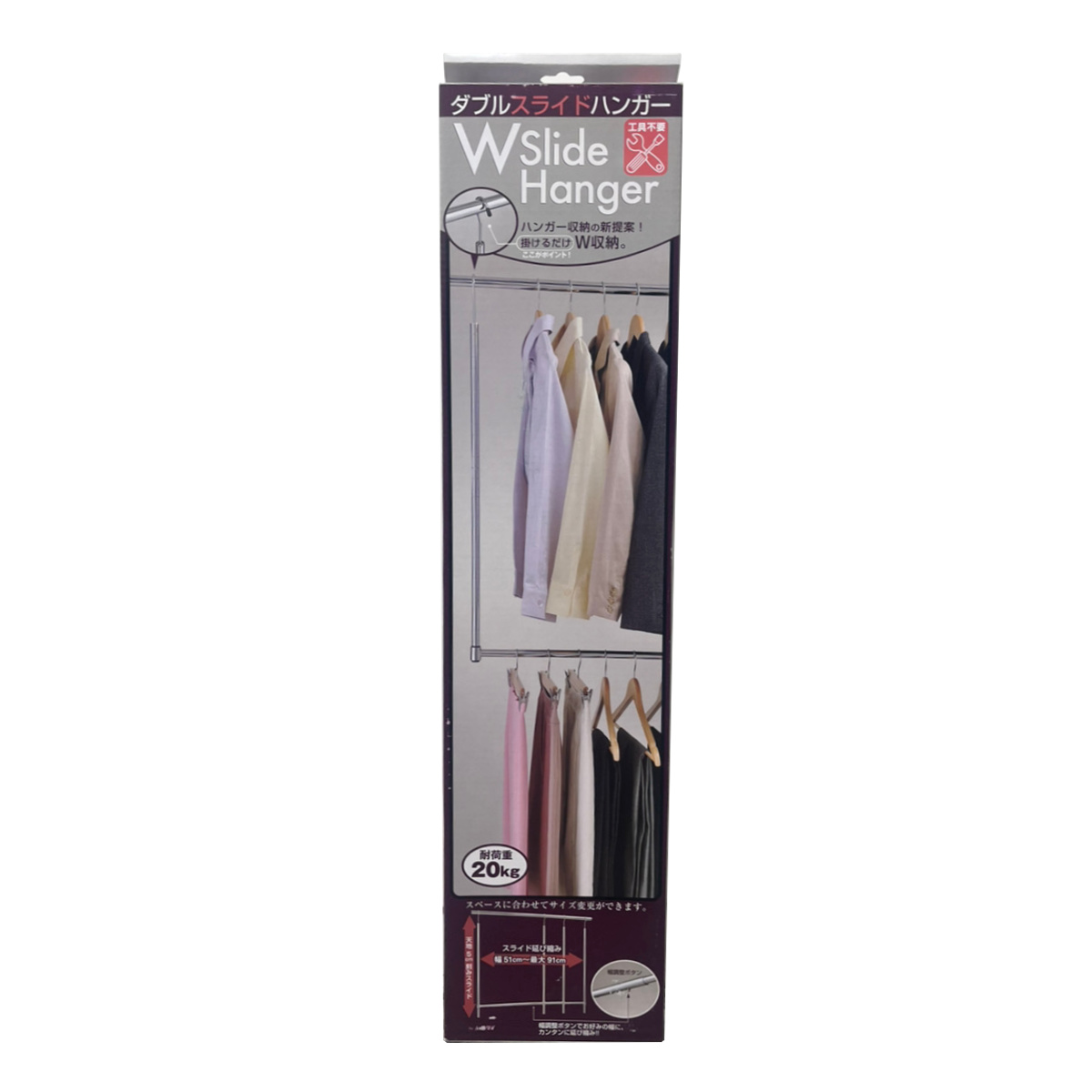 お手持ちのハンガー掛けにフック部分を掛けることで、収納面積を約2倍にアップできます。幅調整ボタンでお好みの幅に調整できるので、スペースに合わせてお使いいただけます。クローゼット内の空間や狭いスペースも有効活用でき便利です。