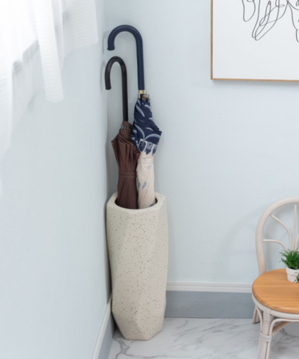 石のようなデザインが施されたモダンテイストな陶器製です。陶器は水に強く、濡れたままの傘を入れてもサビの心配がありません。また、重みがあるため安定感もあります。