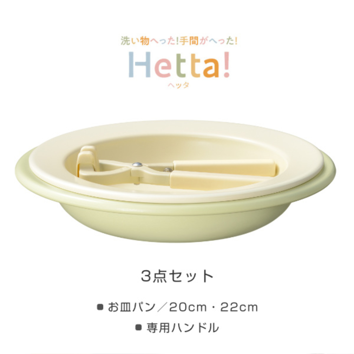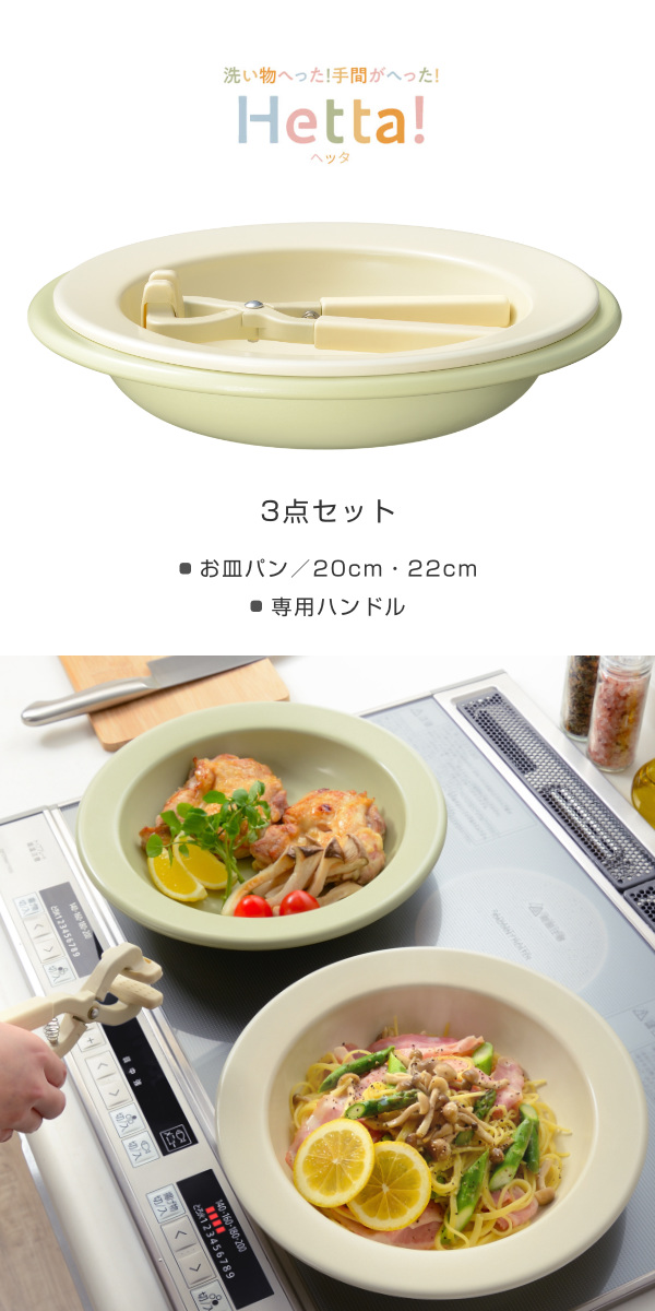 フライパンとお皿がひとつになった「Hetta!」シリーズの、お皿パン20cm(ホワイト)・22cm(グリーン)と専用ハンドルの3点セットです。調理から食事までがこれひとつで叶い、盛り付けいらず&洗い物最小限で、家事の手間をぐっと減らせます。