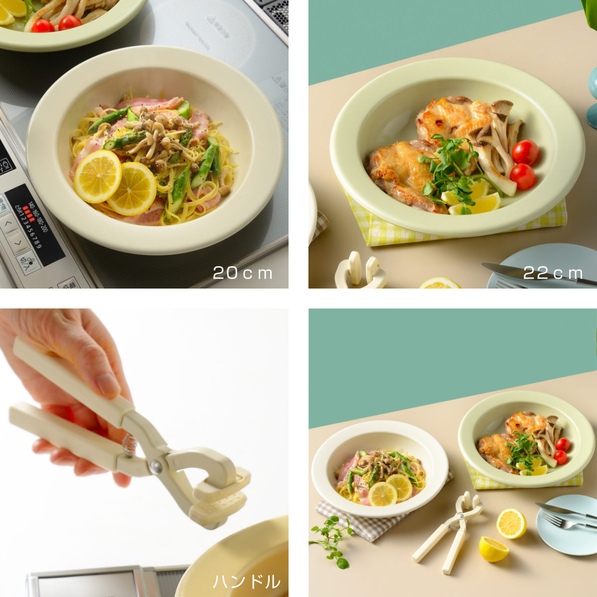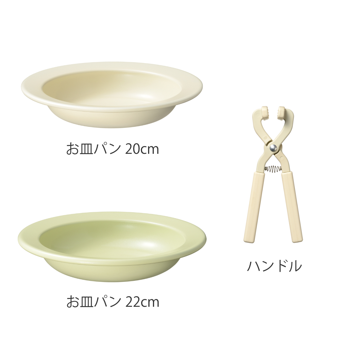 1~2人分のお料理に使いやすい20cm(ホワイト)、2~3人分の炒め物などにも使いやすい22cm(グリーン)のお皿パン2サイズと、専用ハンドルが付いた3点セットです。