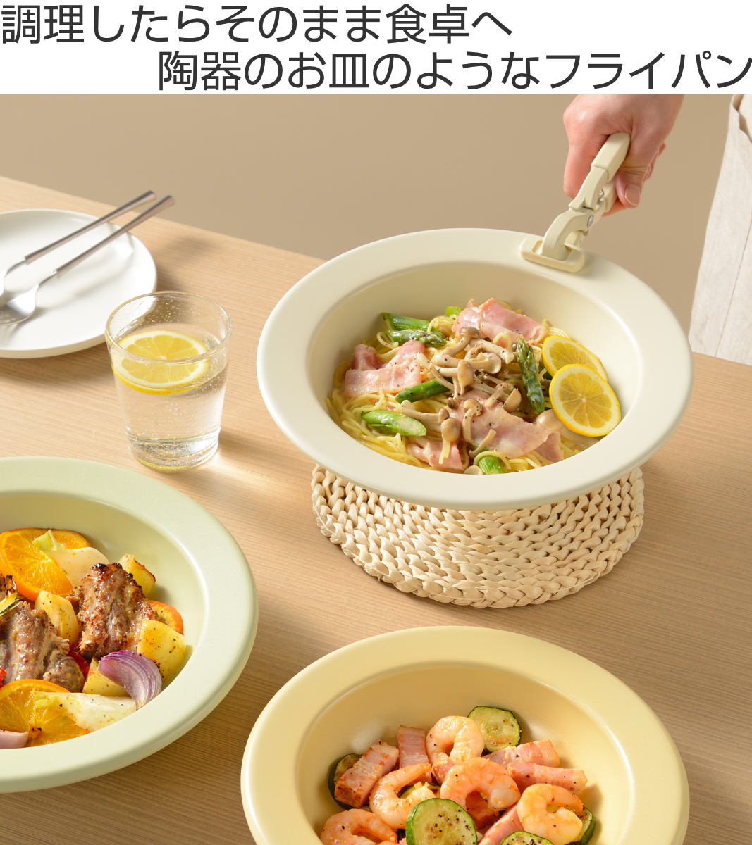 フライパンとは思えないデザイン性の高さも魅力です。温かみのある落ち着いたカラーとマットな質感。陶器のお皿のような風合いで食卓をおしゃれに彩ります。
