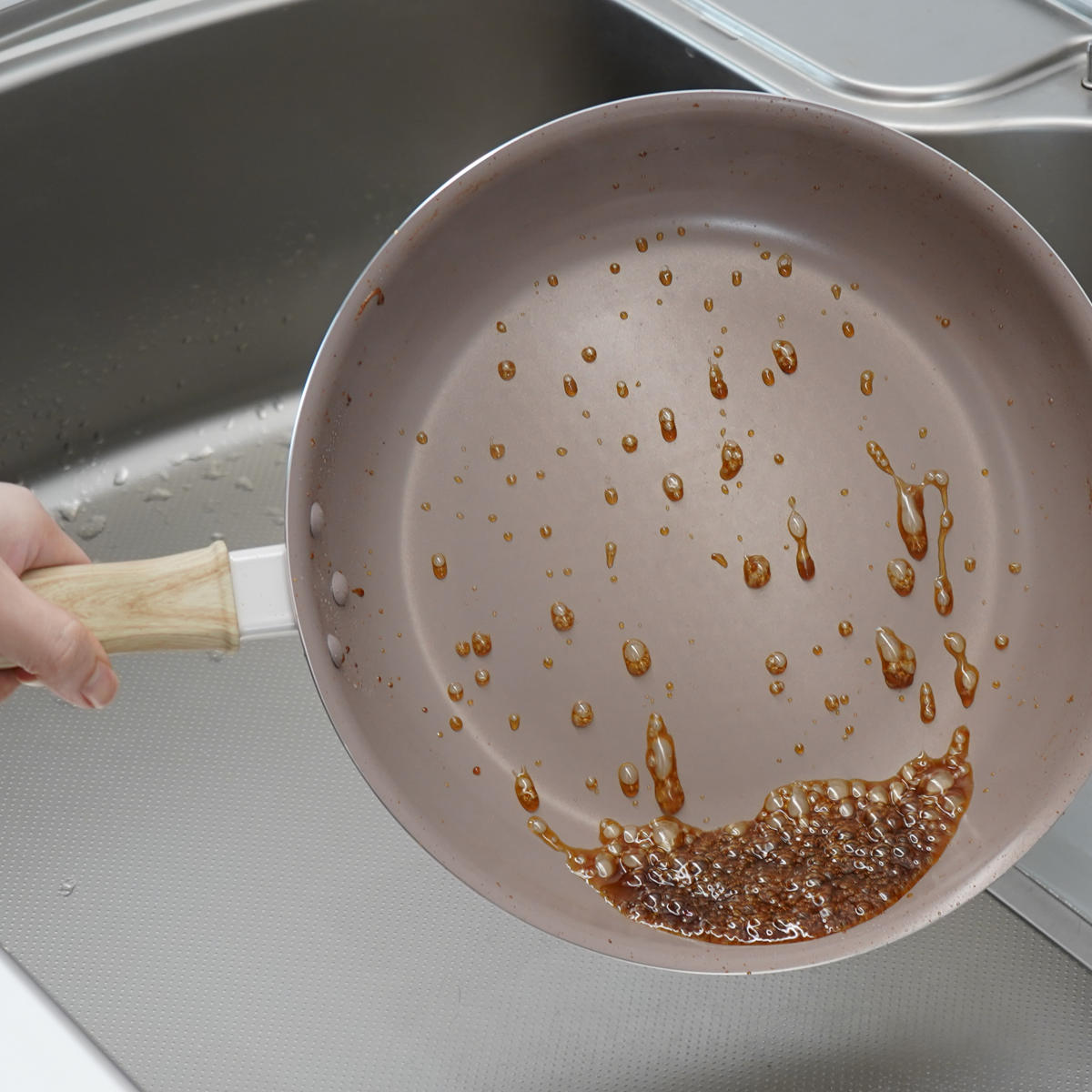 内面には、耐久性の高いふっ素樹脂スピンコート加工が施されています。少ない油でもこびりつきにくく、毎日の料理もお手入れも楽々です。