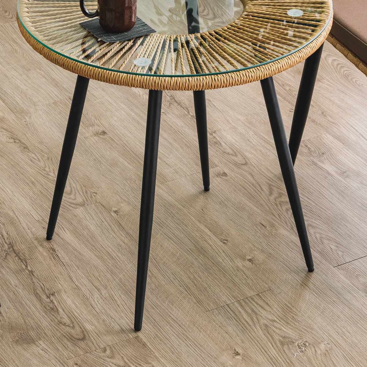 人工ラタンとガラス、ブラックスチールの組み合わせが絶妙なサイドテーブルです。ラタン調のデザインが置くだけでリゾート感を演出。ゆったりとした癒しのひとときをお過ごしいただけます。天板のガラスが涼しさと抜け感を生み、スリムなスチール脚がすっきりとした印象を与えるため、圧迫感が少なく、お部屋も広々と感じられます。
