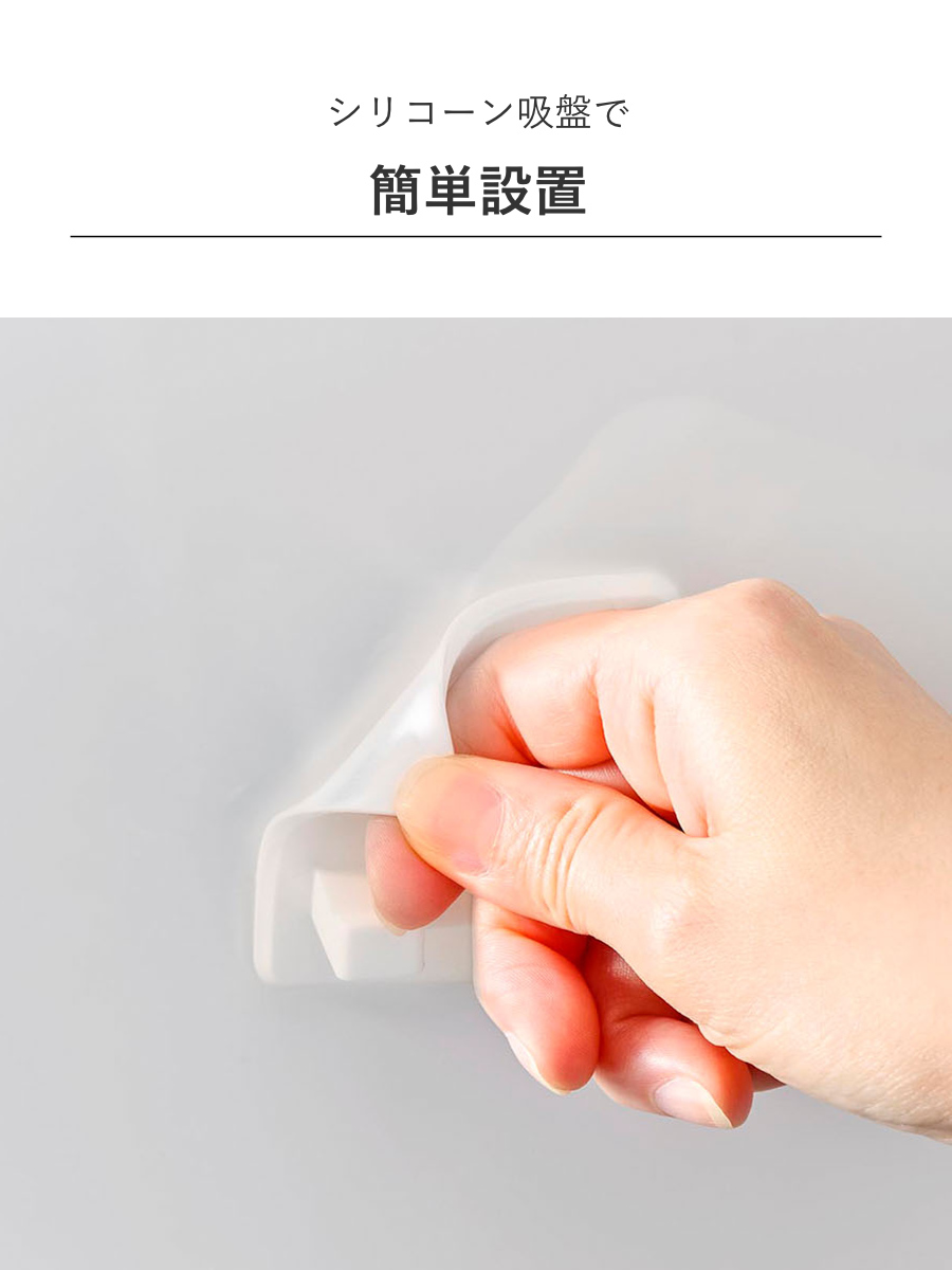 シリコーン製の吸盤で、壁に穴をあけずに設置できます。柔らかい素材で付け外しもお手入れも簡単です。