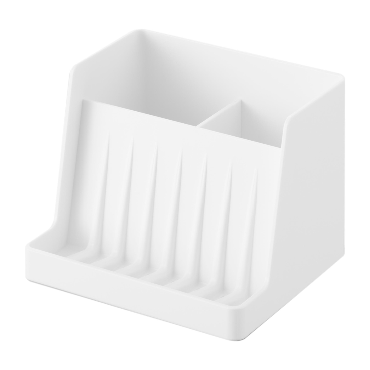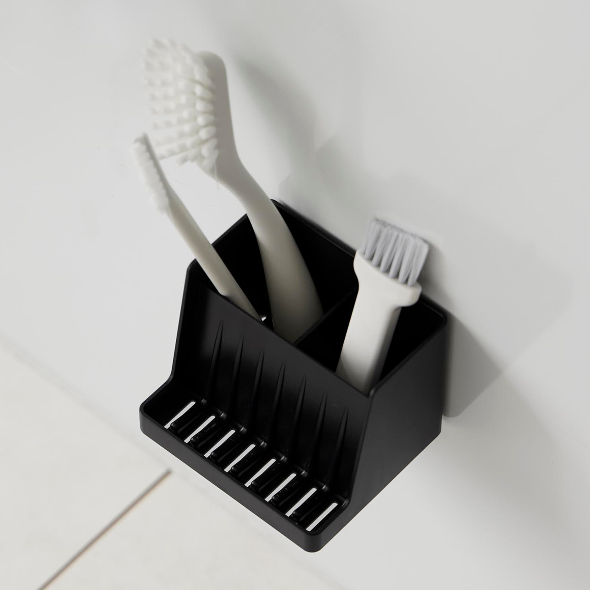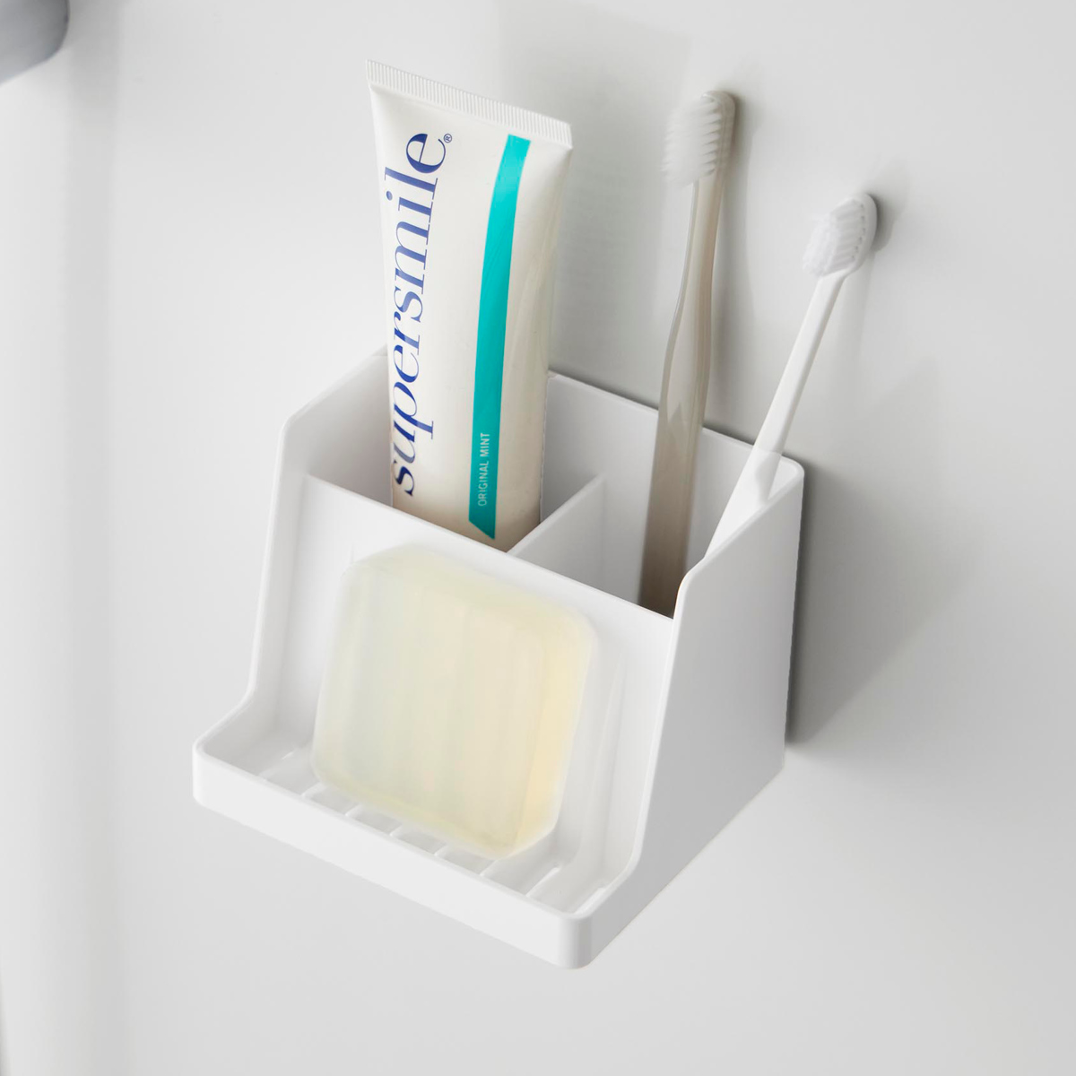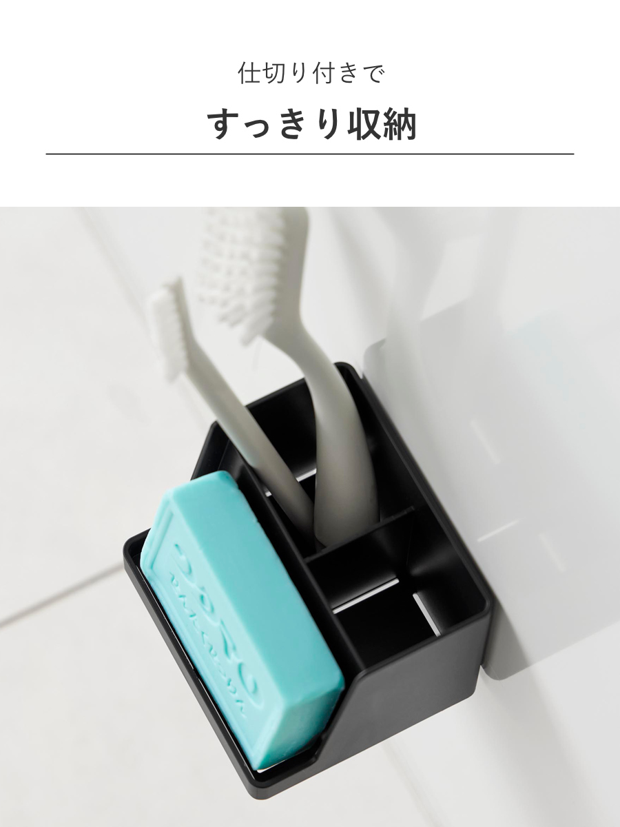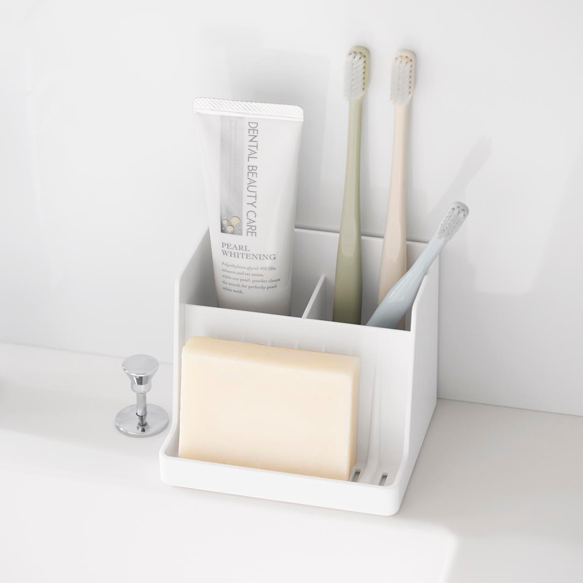 収納スペースと仕切り付きで、石けんと洗面小物をひとまとめに収納できます。洗面用品だけでなく、洗濯用石けんと洗濯ブラシセットの収納にもおすすめです。