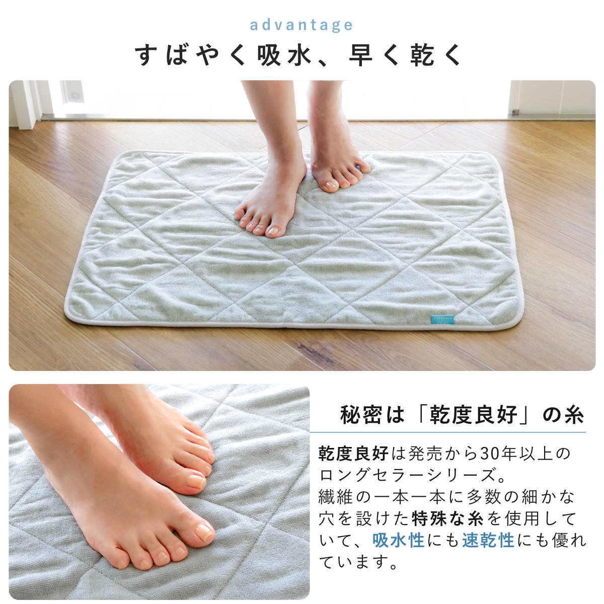 ふんわり心地よい肌触りのタオルを2枚重ねにすることで、足元を優しく包み込んでくれるような感触になっています。水が床に抜けにくく、いつでもさらっと快適です。