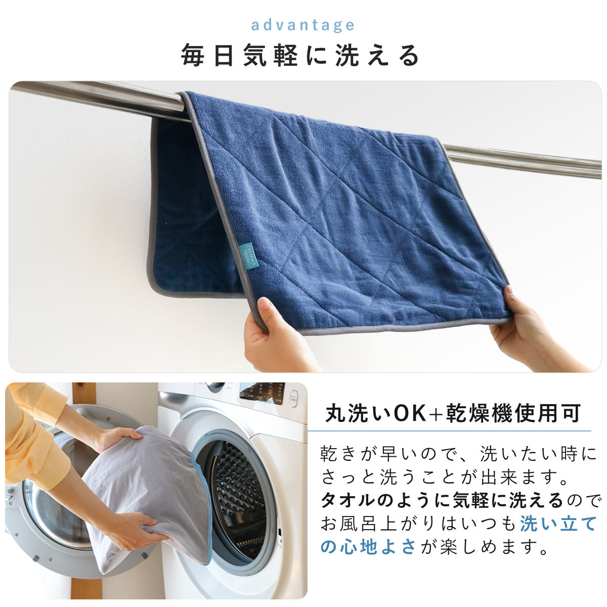 他の洗濯物と一緒に洗濯できて乾燥機も使えるので、忙しい毎日でも洗濯しやすいのが嬉しいポイント。更に優れた速乾性で、洗濯後の脱水した時点で「乾いている」と感じられるほどです。