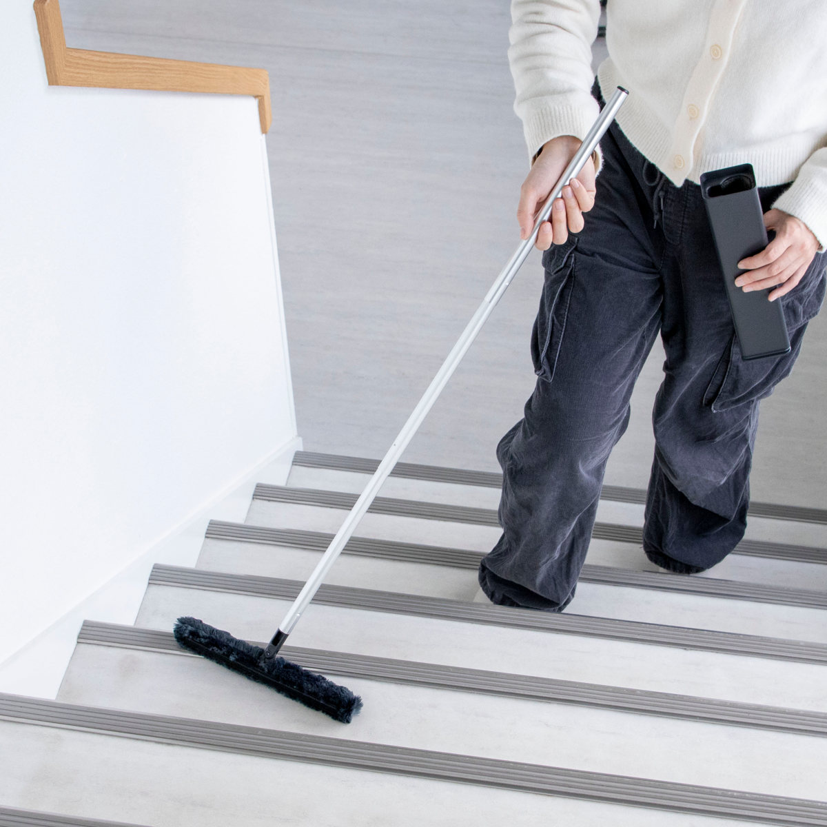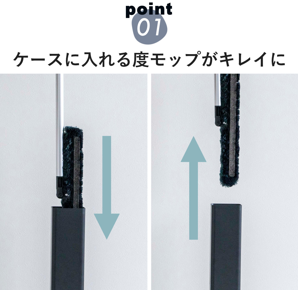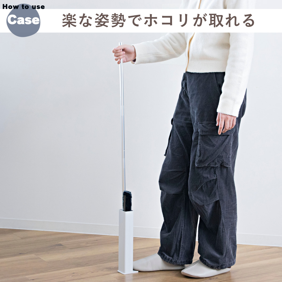 ケースに差し込むだけで、モップについたホコリが簡単に落ちます。ケースを持ち運びながら、掃除後のお手入れが手軽にできるので、いつでも気持ちよく繰り返し使えます。