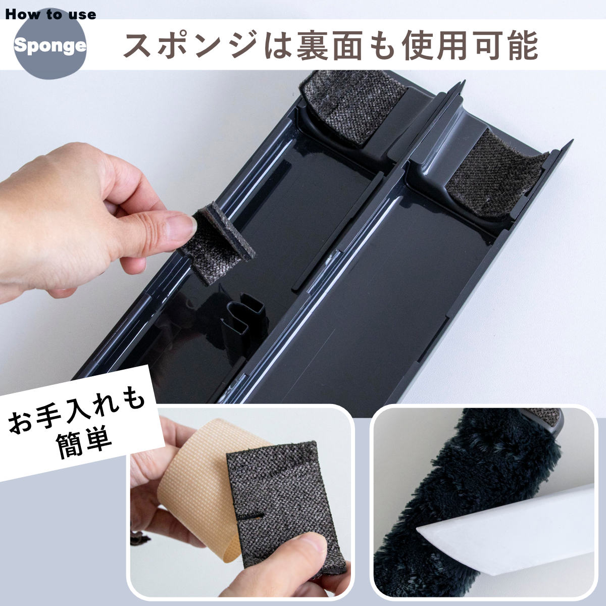 クリーニングスポンジは両面仕様で、ひっくり返してキレイな面を使えます。汚れが目立ってきたらテープや掃除機でお手入れできます。