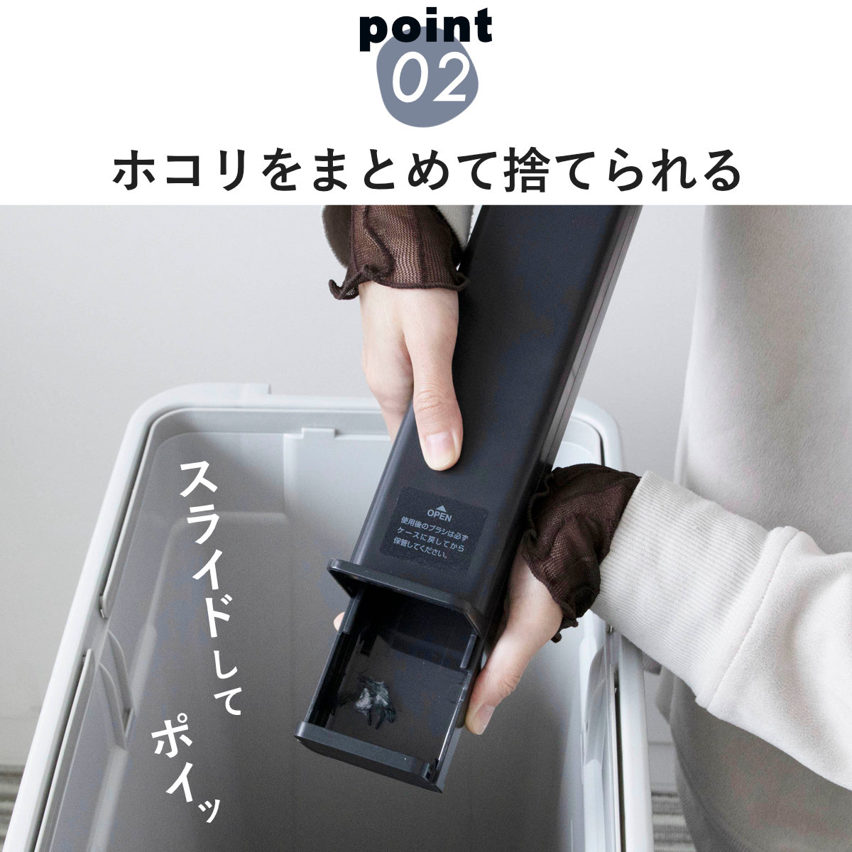 ケースはスライド開閉式。溜まったホコリもケースを開けてサッと捨てられるので、お手入れがとてもラクです。
