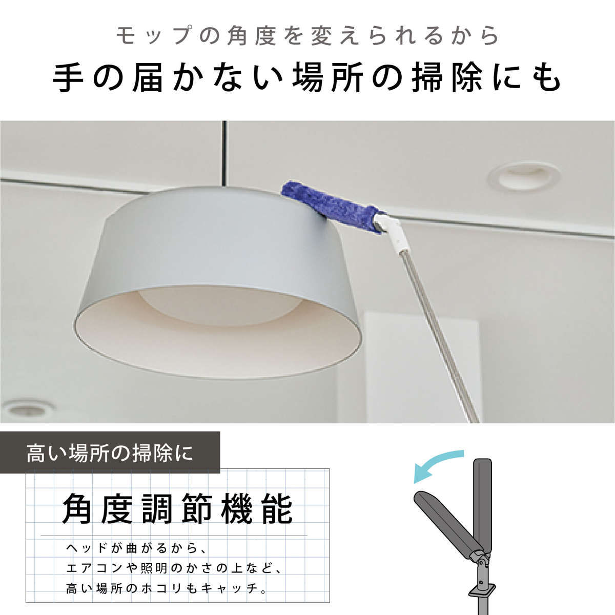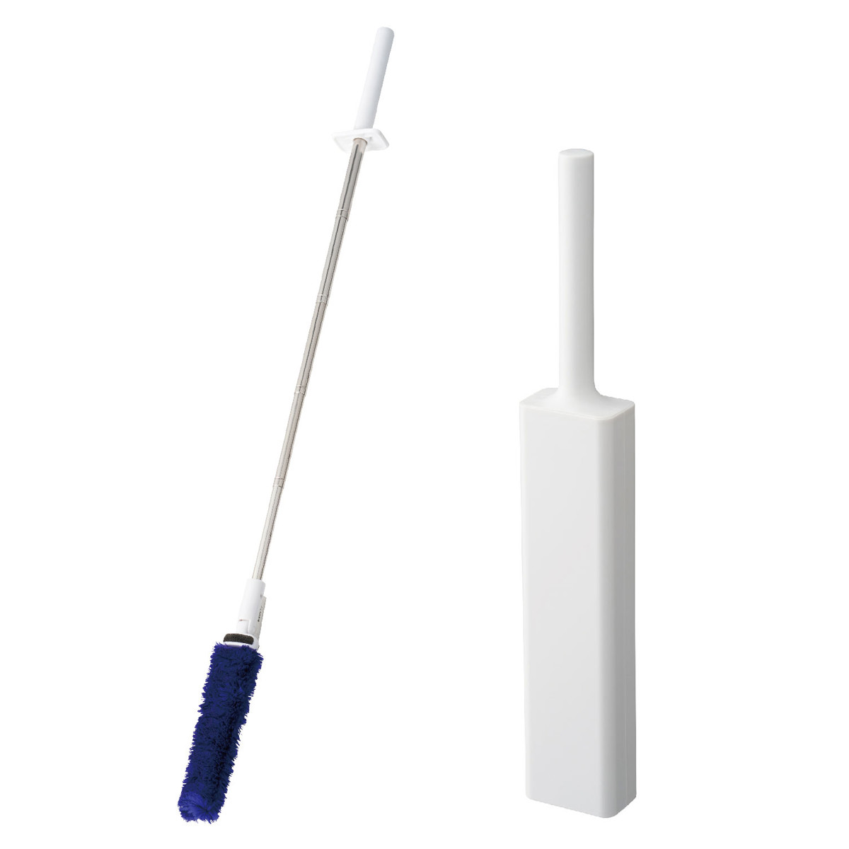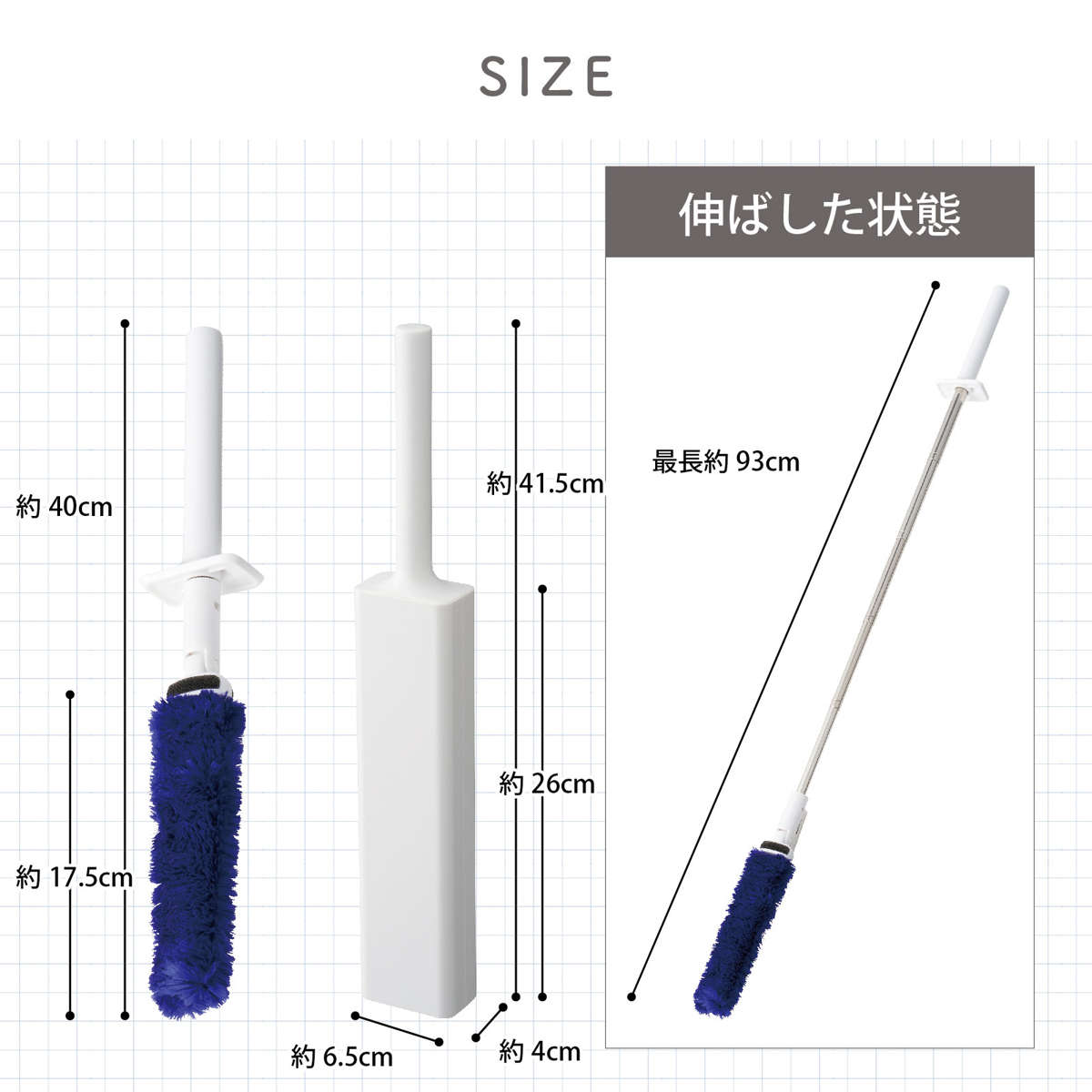 照明やエアコンなどの手の届かない高い所や、家具・家電のスキマなどに便利な、伸縮タイプです。引っ張るだけの簡単伸縮で、柄の長さは最長93cm。細長いモップと長い柄で、隙間も奥までピカピカにできます。