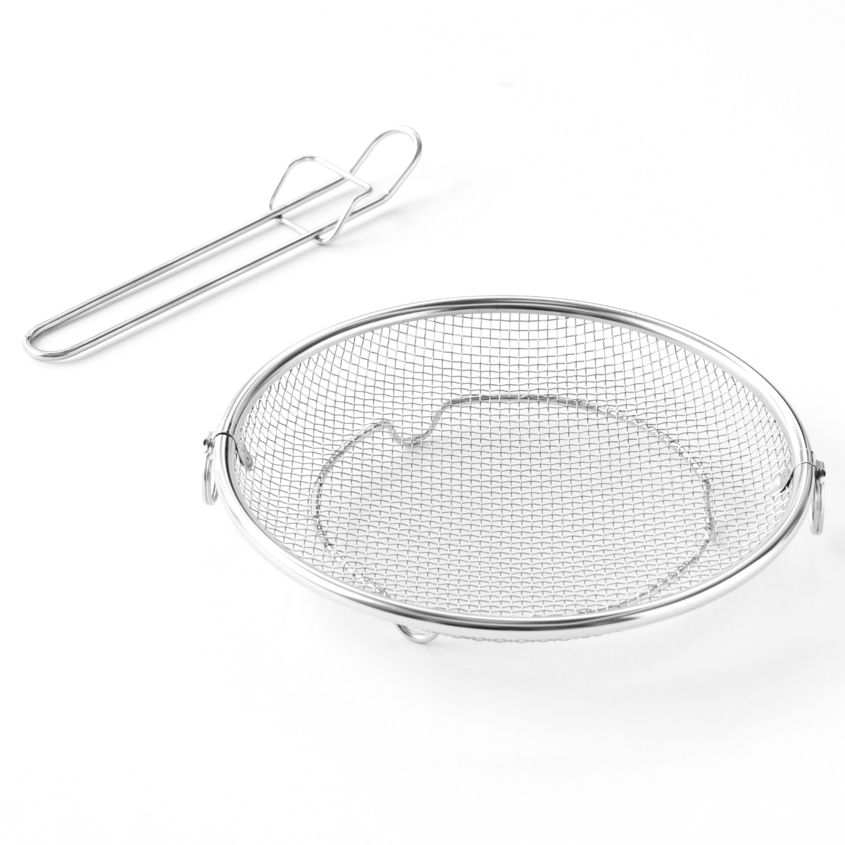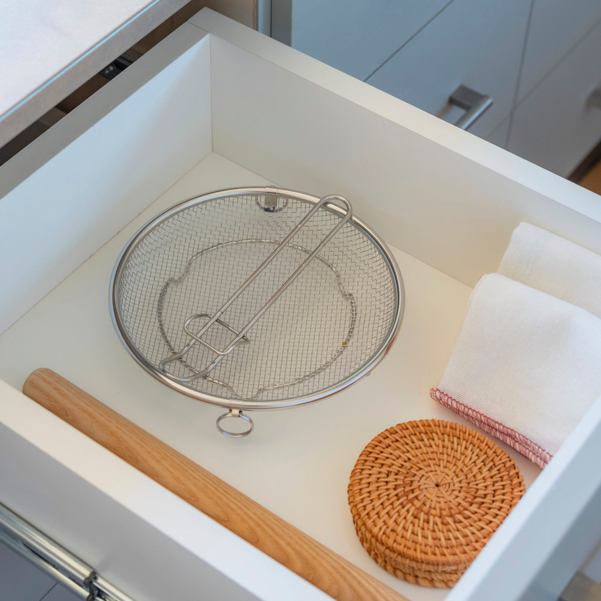 必要な時だけサッと取り出して使える脚付きの盆ざるです。鍋やフライパンにすっきり収まるデザインなので、食器の水切りから麺料理、揚げ物、お鍋の具材、蒸し料理まで幅広くお使いいただけます。