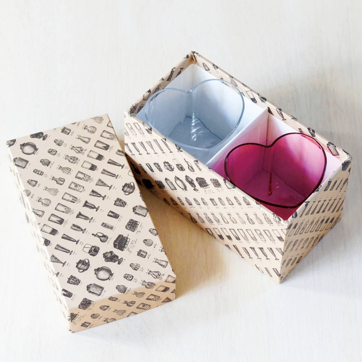 昭和モダン珈琲シリーズのハート型の可愛らしいグラスのペアセットです。コーヒーや炭酸などの飲み物の他に、フルーツ入りカクテルなども愛らしく演出できます。断面がよく見えるのでスポンジ、生クリーム、果実などをトッピングしてグラスケーキにもお使いいただけます。箱入りなので大切な人への贈り物にもおすすめです。