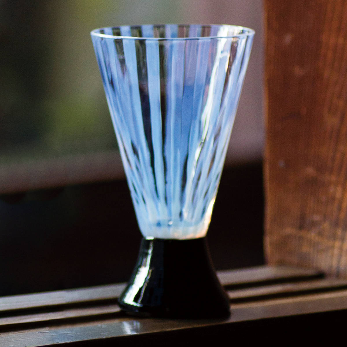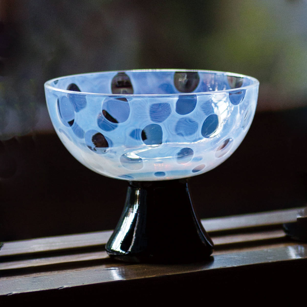 明治大正時代に盛んに使われた日本独特の成型方法で作った乳白色のガラスの器です。乳白硝子と不透明な黒のステムのコントラストが美しい酒杯は、スッキリとしたフォルムで、キリリとお酒の席を演出します。