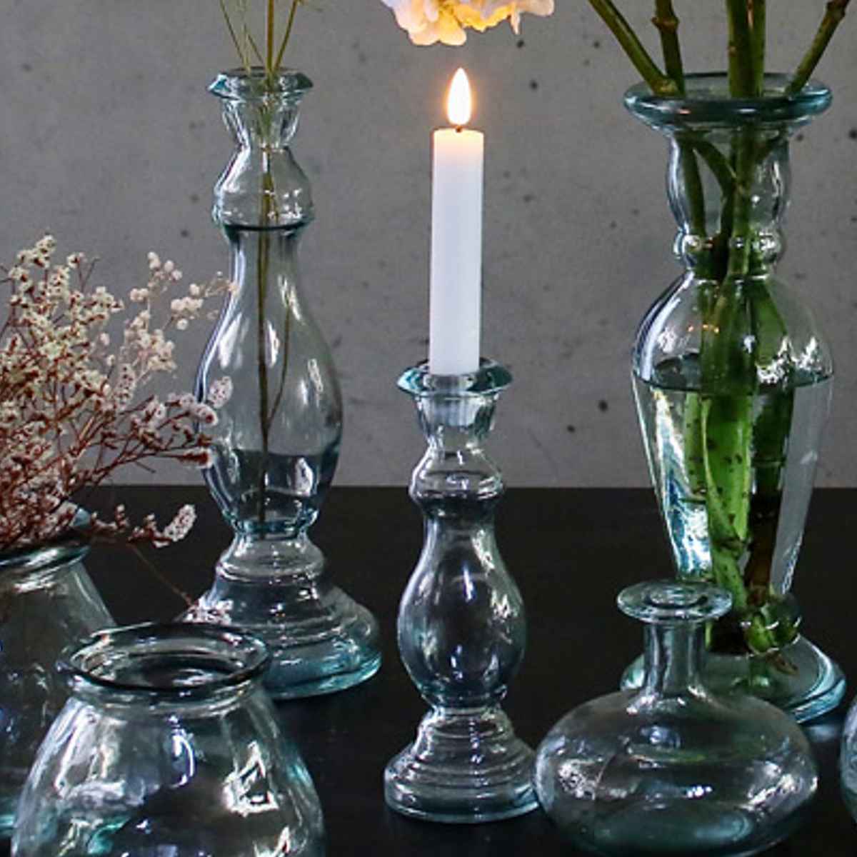 スペイン生まれのリサイクルガラスベースは、独特の揺らぎや気泡を含んでいて個性豊かな仕上がりです。窓辺やテーブルにさりげなく置くだけで、雰囲気のある空間を演出できます。