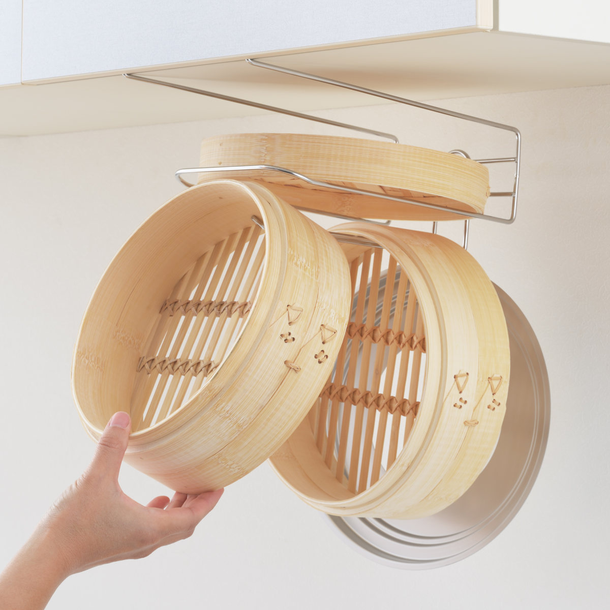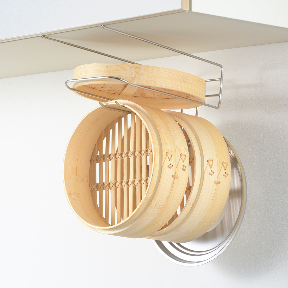 しっかり乾かさないとカビや黒ずみの原因になってしまうせいろをスッキリ乾かせる吊戸棚ラックです。使用後のせいろをそのまま掛けて干しながら保管ができるので、収納場所に困らずキッチン周りを整えることができます。