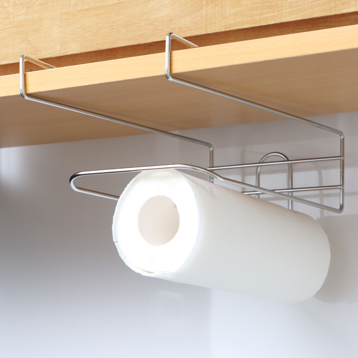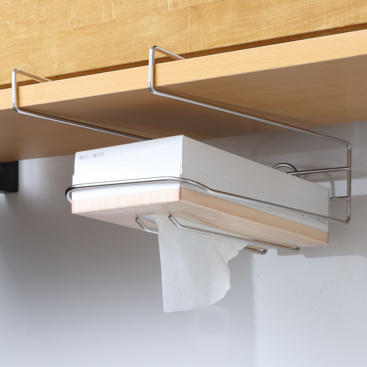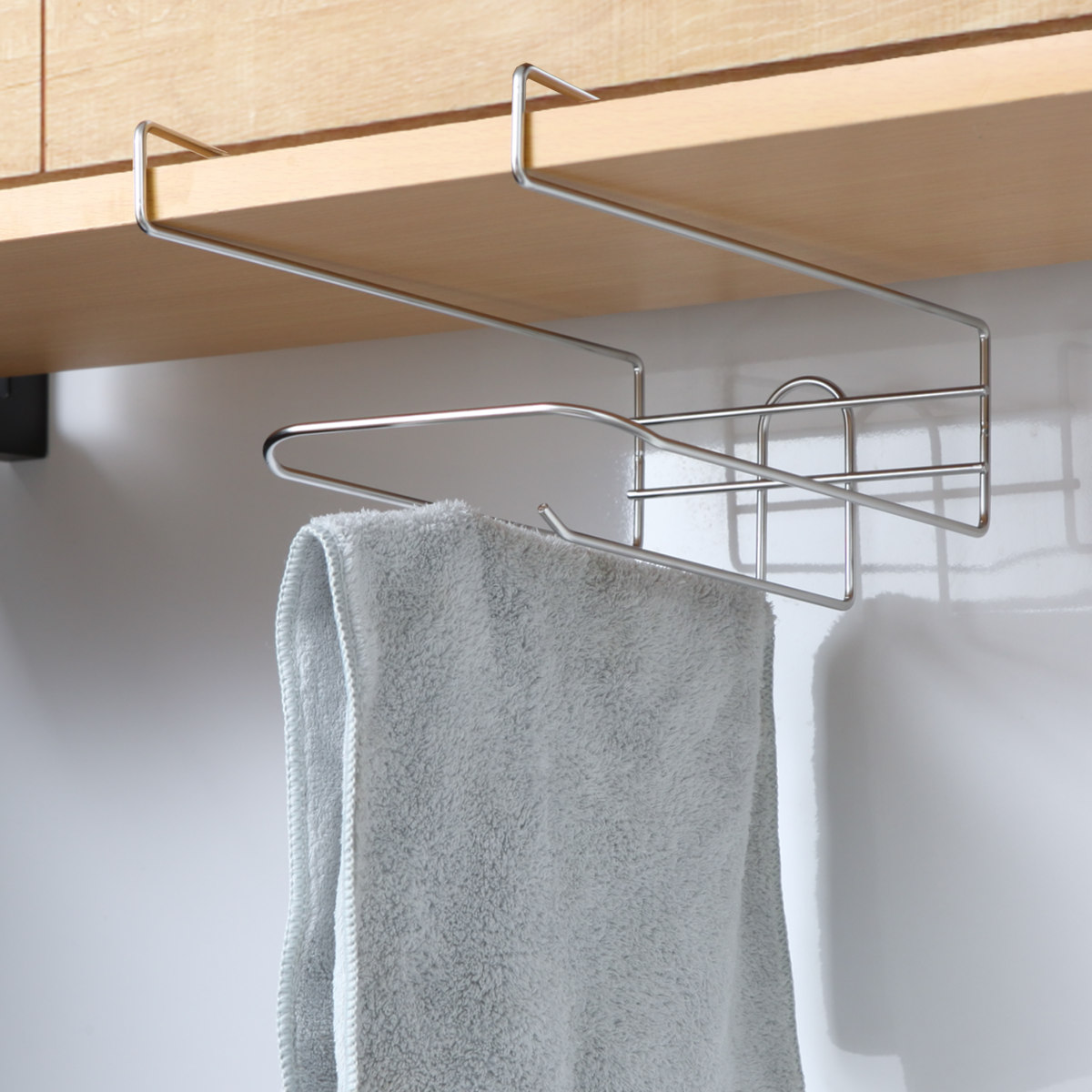 工具不要で吊戸棚の棚板に掛けるだけで簡単に取り付けることができます。吊戸棚や食器棚のデッドスペースを収納スペースとして活用できるのも嬉しいポイントです。