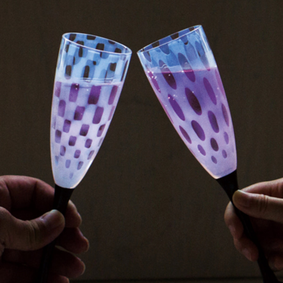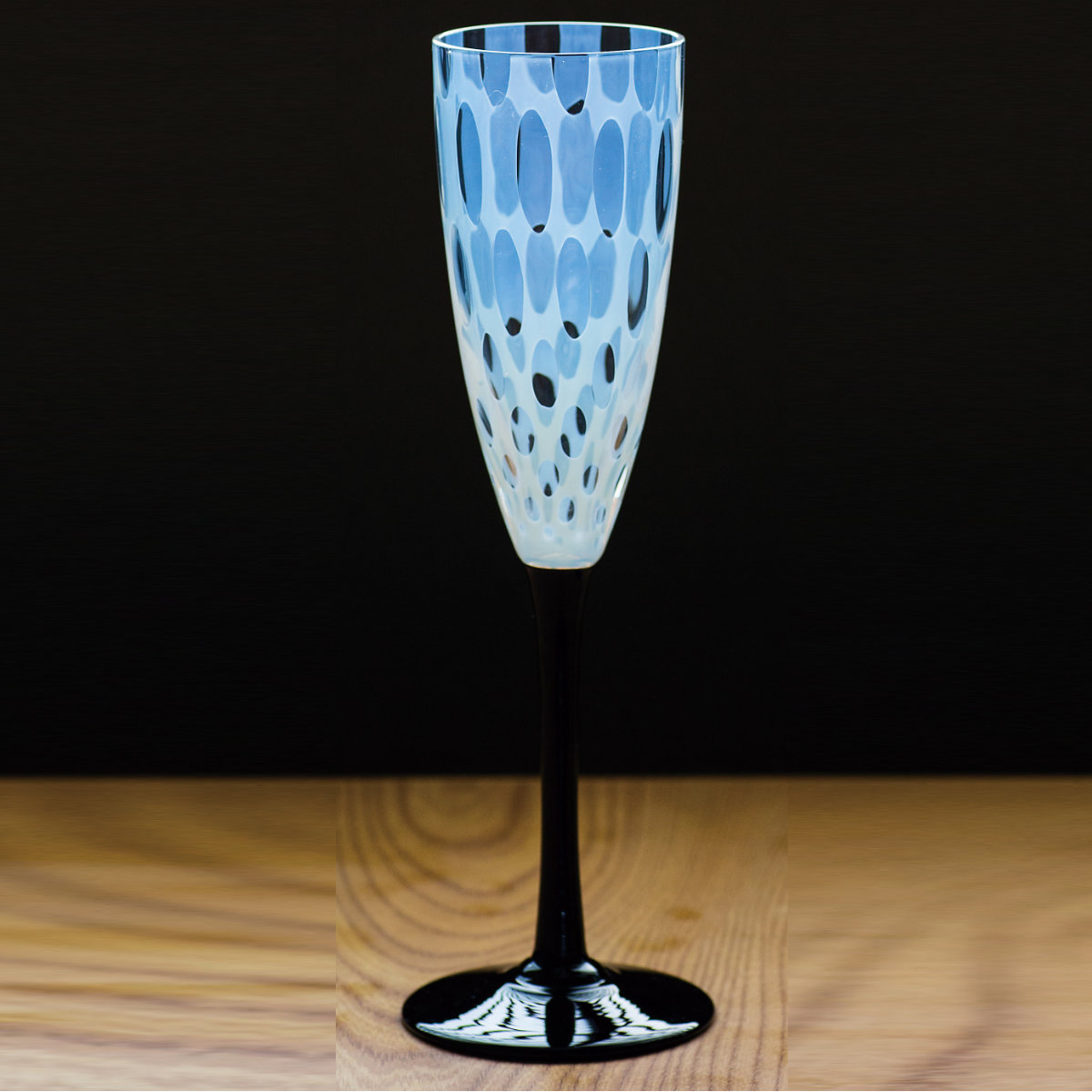 乳白色のガラスに水玉模様が浮かび上がる「あぶり出し技法」を用いたモダンでありながら、和のテイストも感じさせるデザインのワイングラスです。泡が立つシャンパンやスパークリングワインがおススメです。特別な日の乾杯や大切な人への贈り物にも最適です。