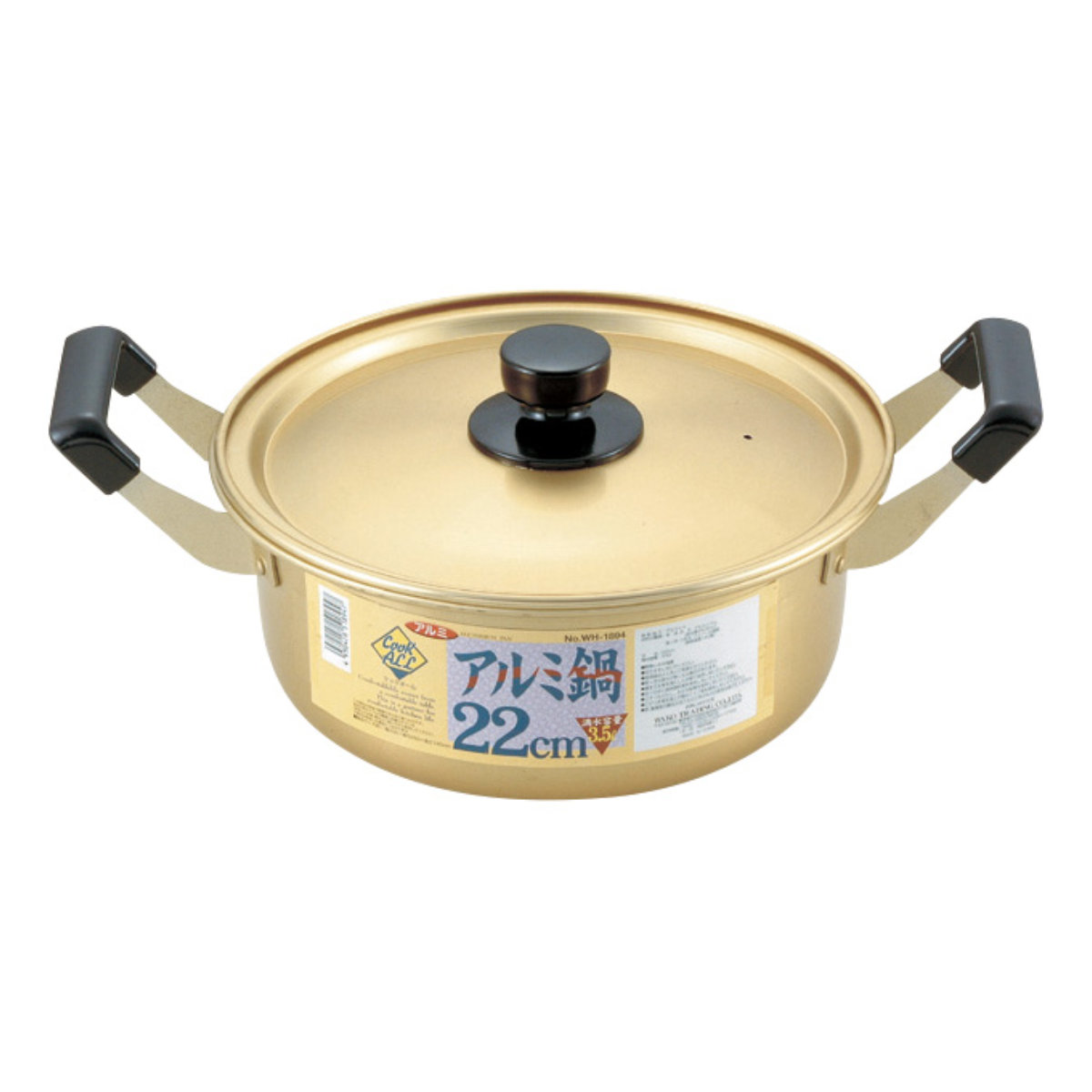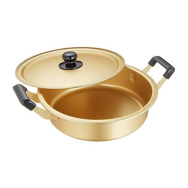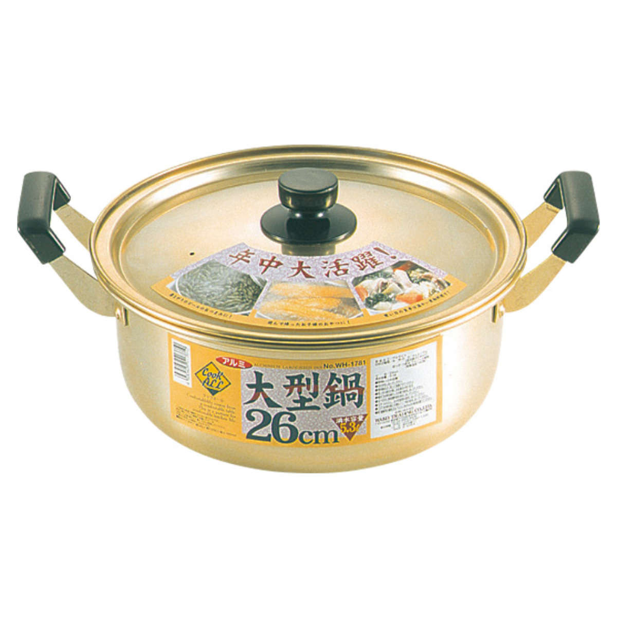 使いやすいベーシックな両手アルミ鍋26cm浅型です。ご家族分の豚汁やカレーなどを作るのにも使いやすいサイズです。浅型なので鍋料理にも便利です。アルミ鍋は、熱伝導性に加えて、軽くて扱いやすい操作性にも優れています。表面は薄いアルマイト被膜を作る処理(本蓚酸アルマイト加工)を施してあるので酸化・腐食しにくく、光沢も長持ちします。長持ちさせるためにも、空焚きや金属たわし等はおさけ下さい。IHクッキングヒーターには対応しておりません。