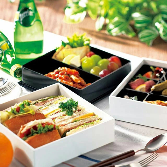 下段には取り外しが出来る9個の仕切りが付いており、ホームパーティやオードブル、おせちなどいろいろな場面でお使いいただけます。