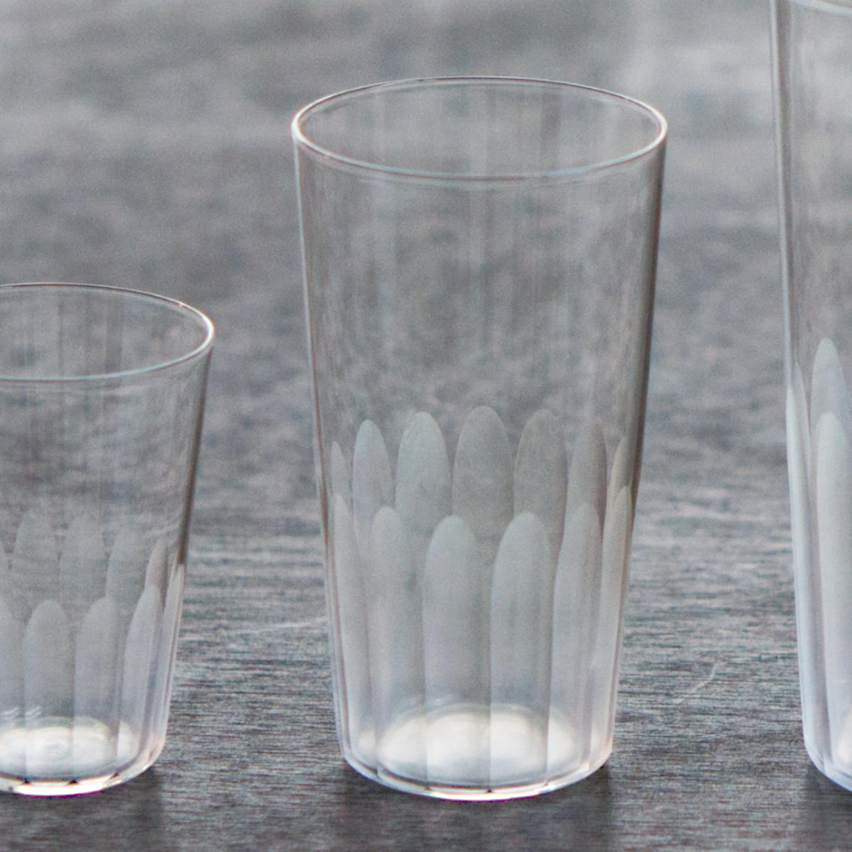 薄手のガラスに施された高い技術によるカット模様。柄は蒲鉾をイメージした独特なデザインで、職人技が光ります。