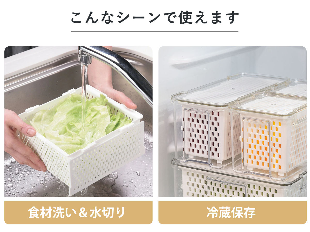 ●食材を洗って水切り、そのまま保存できる、ザル付き保存容器です。